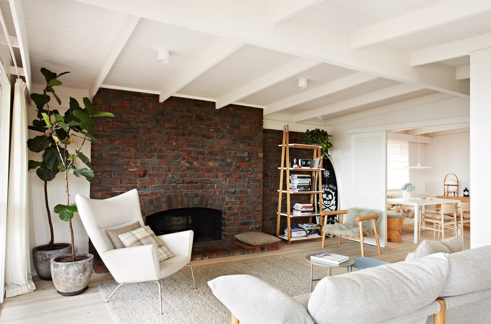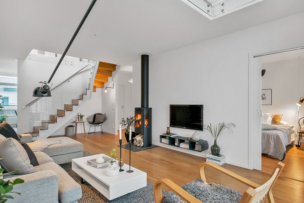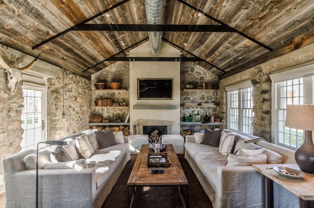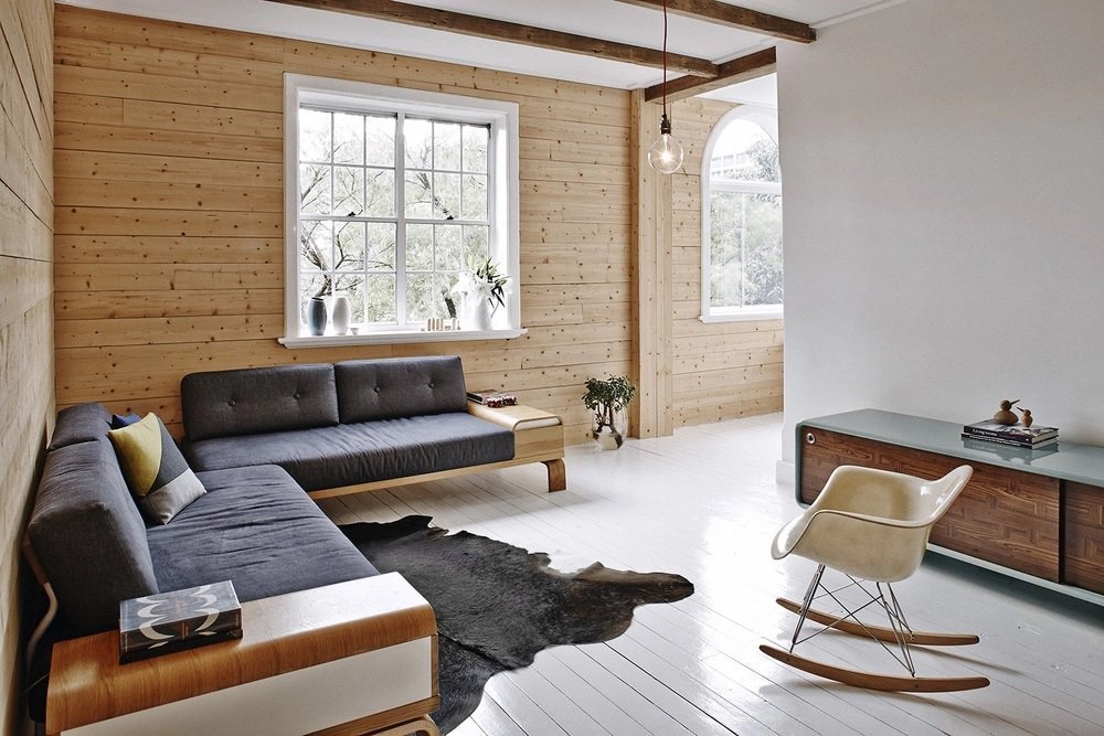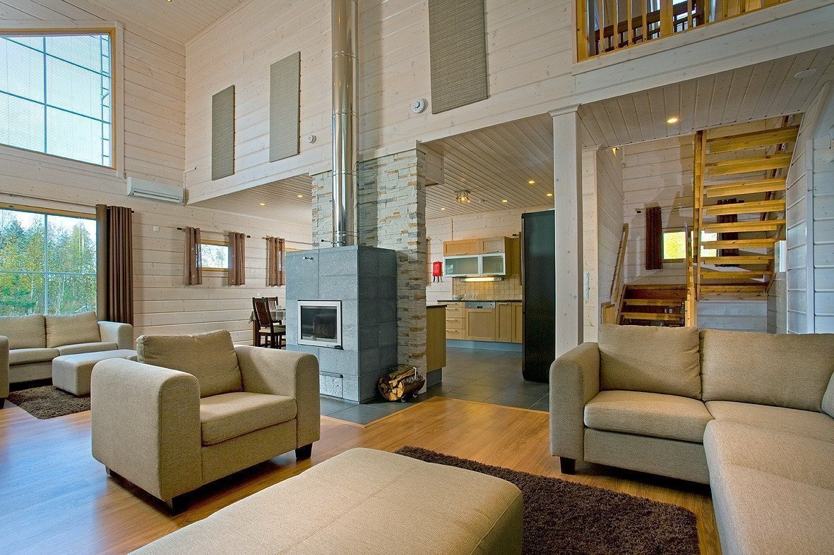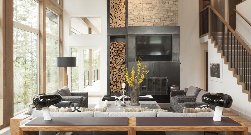 Estilo escandinavo Se caracteriza por el uso de colores fríos, ventanas anchas, una chimenea y una decoración "natural". Estos últimos incluyen ramas reales en las paredes, caminos hechos con cortes de madera para aserrar, pieles de animales en el piso.