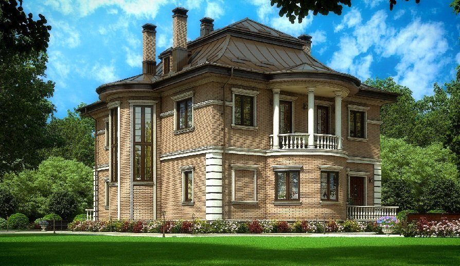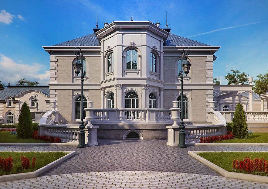 El clasicismo une a todo un grupo de estilos bajo su "ala". Direcciones desarrolladas de forma autónoma en rincones separados del planeta. Hay italiano, inglés, francés, clásico alemán. Sin embargo, se observa la presencia de detalles comunes en estas diferentes áreas. Cualquier clásico prefiere formas suaves en elementos pequeños que decoran la casa desde el exterior. Las columnas, balaustradas, arcos, rosetas, zócalos de fachada, frontones, pilastras, rústicas, paneles, piedras de castillo pueden desempeñar su papel. La abundancia de estos detalles se ve acogedora y elegante. La solución de tono basada en contrastes ligeros le da a los edificios un sabor especial. El blanco a menudo se usa como un color secundario (la decoración está hecha en él), lo que enfatiza la severidad de los tonos principales de gris, café, marrón, melocotón y arena. Para enfatizar el lujo del exterior, los elementos decorativos están hechos con técnica de estuco con adornos florales y suaves "rizos".