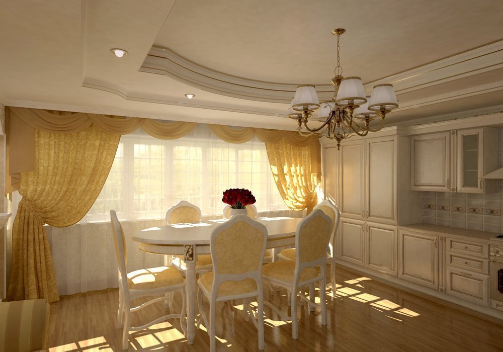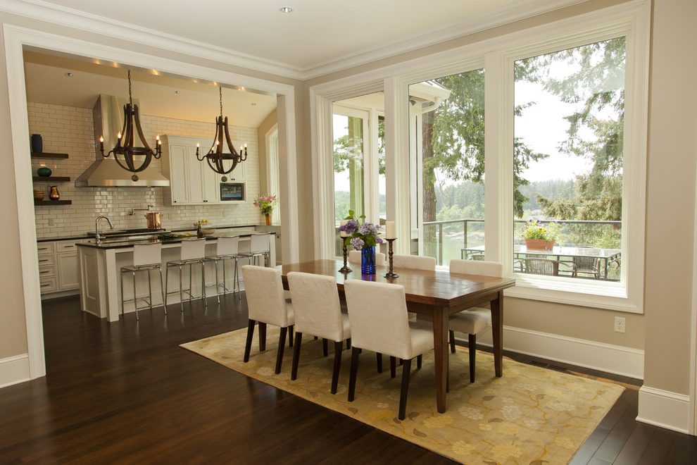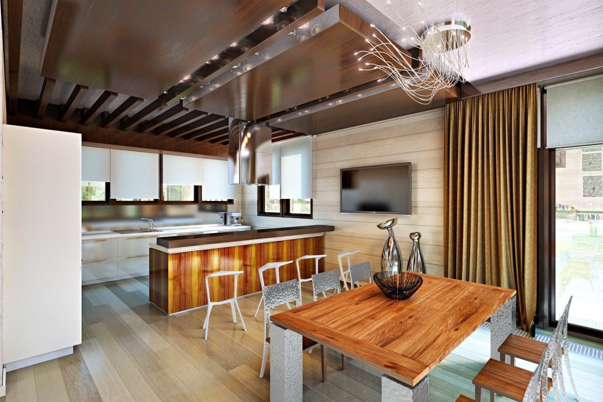 El comedor es una zona única que no puede existir por separado de los demás. Ella necesariamente juega el papel de una aplicación en la cocina o la sala de estar. Intenta imaginar un comedor separado. La fantasía inevitablemente lo llevará a espaciosos salones en elegantes palacios donde se organizan recepciones para más de cien personas. Debido a asociaciones pomposas, la sala suele estar junto a la sala culinaria, incluso si es posible equiparla por separado. La cocina de la cabaña difiere no solo en dimensiones, sino también en mucha luz natural. En los apartamentos típicos, debe contentarse con una pequeña ventana, que a menudo también se abre a un balcón o galería. En consecuencia, incluso los lados soleados no se salvan de la atmósfera desagradable del crepúsculo durante el día, que surge de la escasez de luz natural. El comedor, por regla general, está separado de la cocina por una partición convencional. En su papel, el mostrador del bar se ve bien. Si es necesario, puede servir como una encimera adicional, y en momentos normales puede tomar una taza de té o una copa de cóctel.