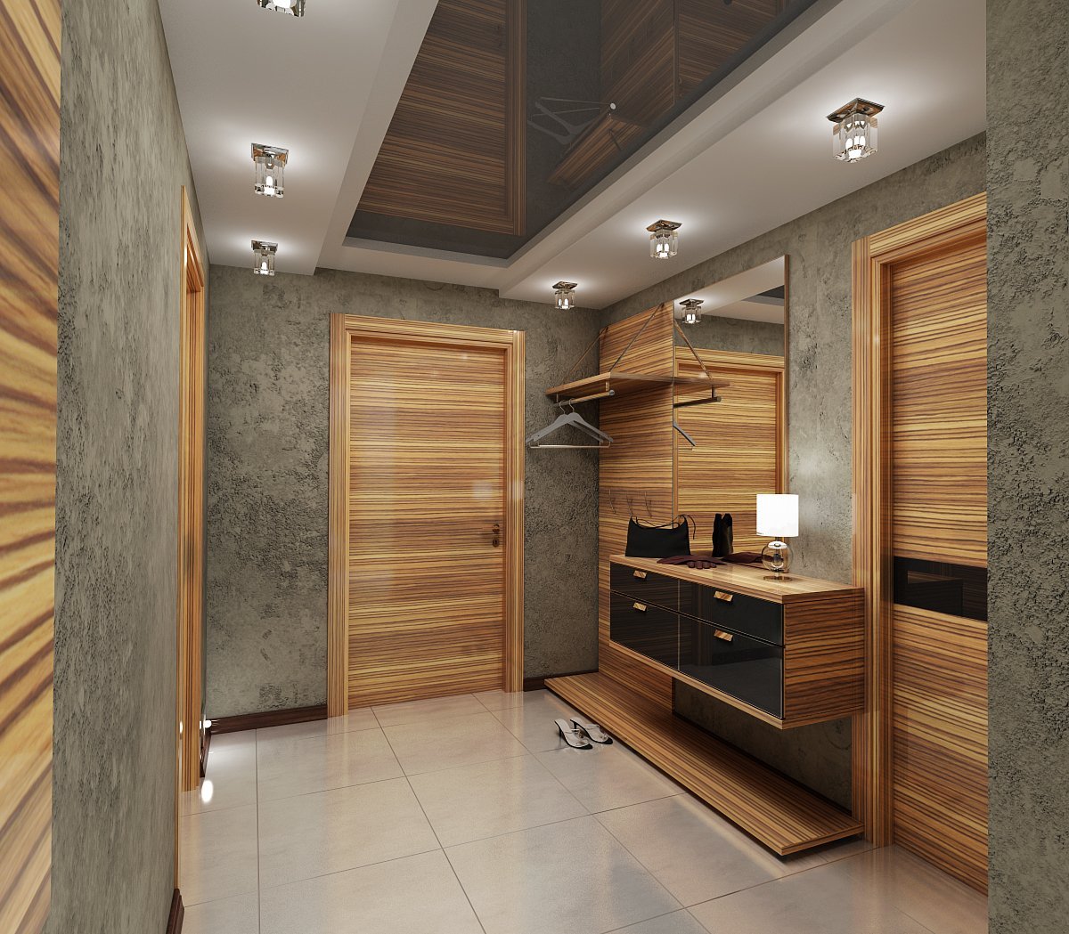 El pasillo difiere del pasillo en sus dimensiones. Esta última es una habitación entre la puerta de entrada y las salas de estar de la cabaña. En el 80% de los casos, una escalera al segundo piso se encuentra en el pasillo. Esta opción le permite no atravesar una serie de otras habitaciones, de modo que desde la entrada suba inmediatamente a su habitación. Una pequeña área para zapatos con una percha debajo de la ropa exterior y soportes para sombrillas, fluye suavemente hacia el amplio salón. Se le da cada vez más una forma redonda y aerodinámica. A la misma distancia entre sí, se encuentran puertas a otras habitaciones.