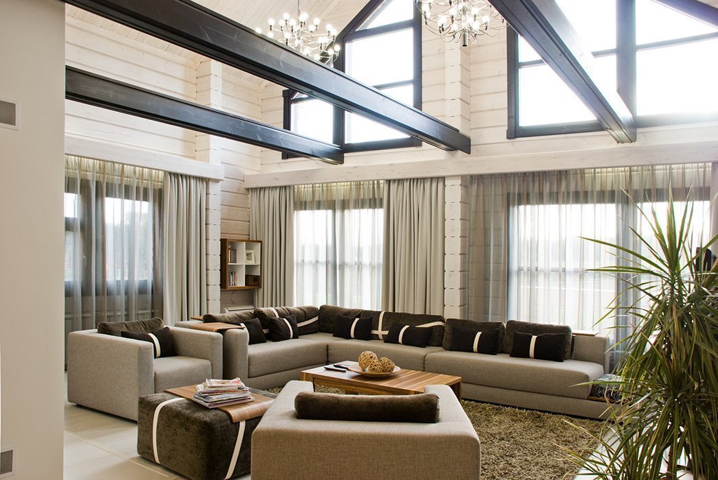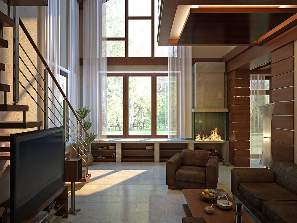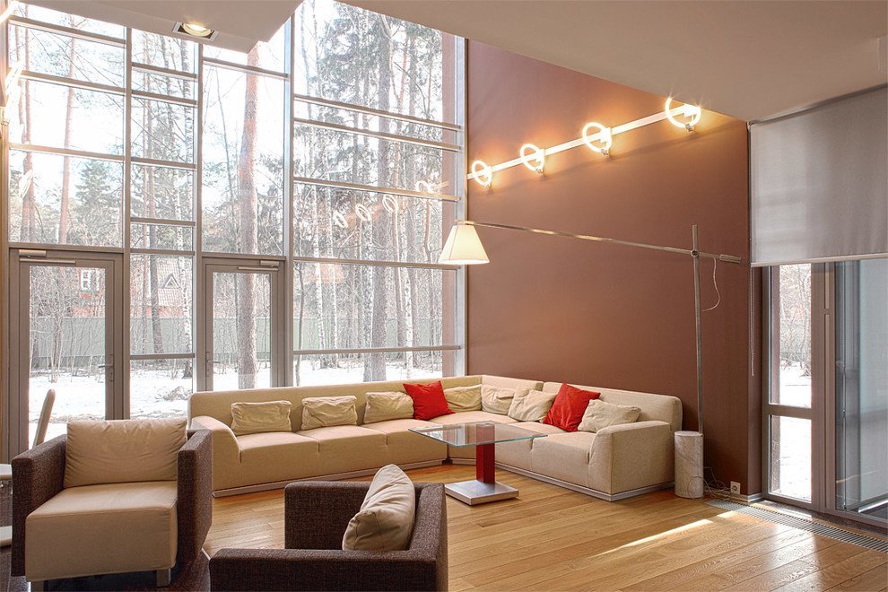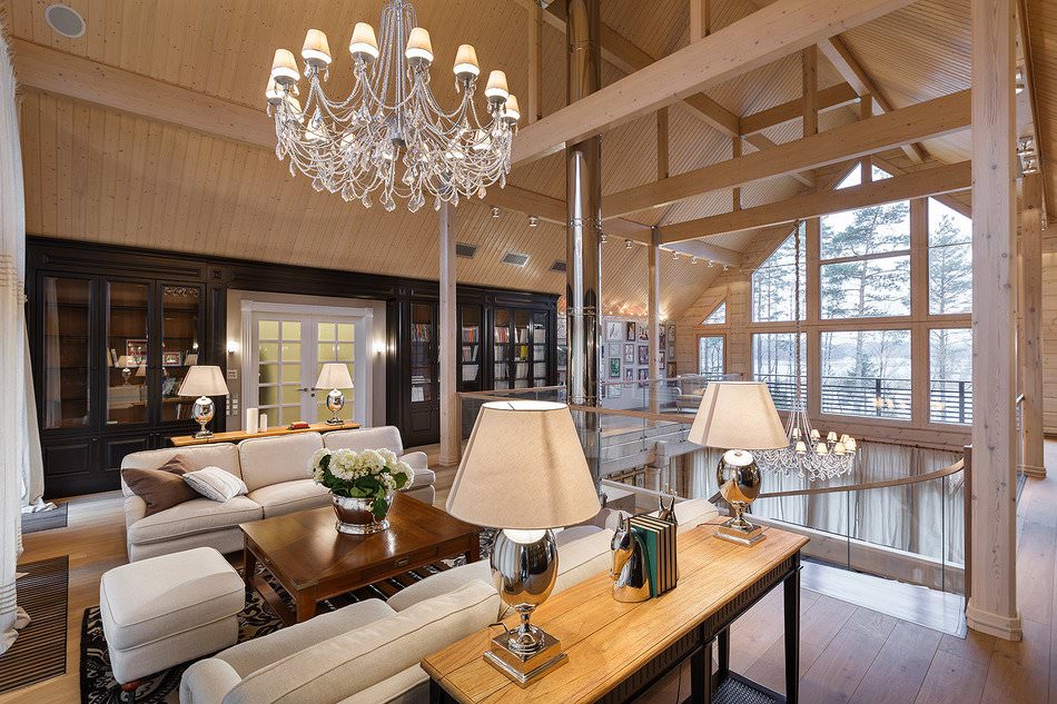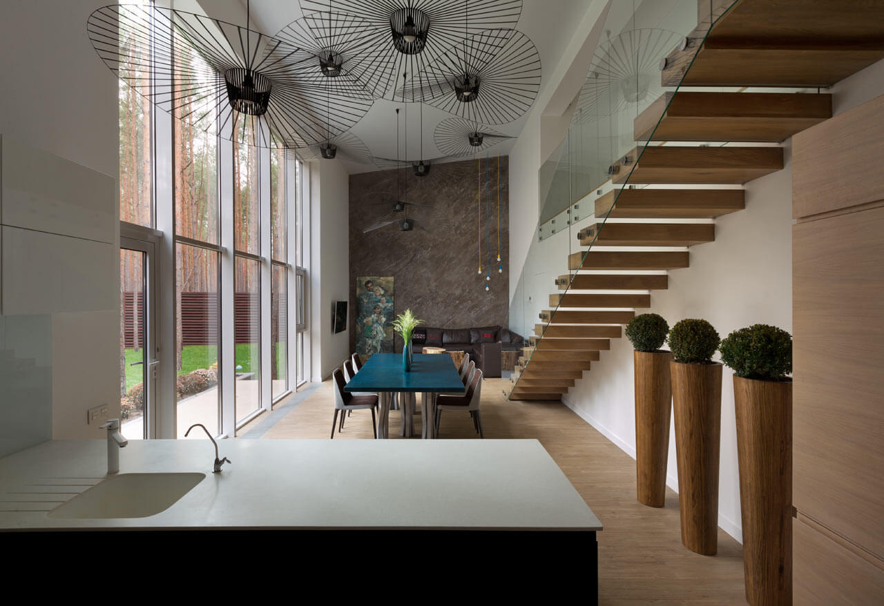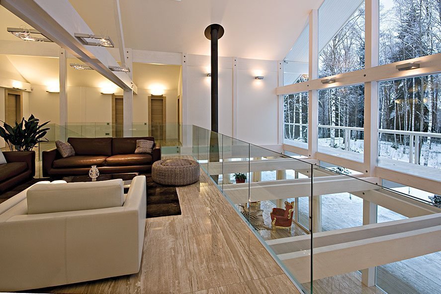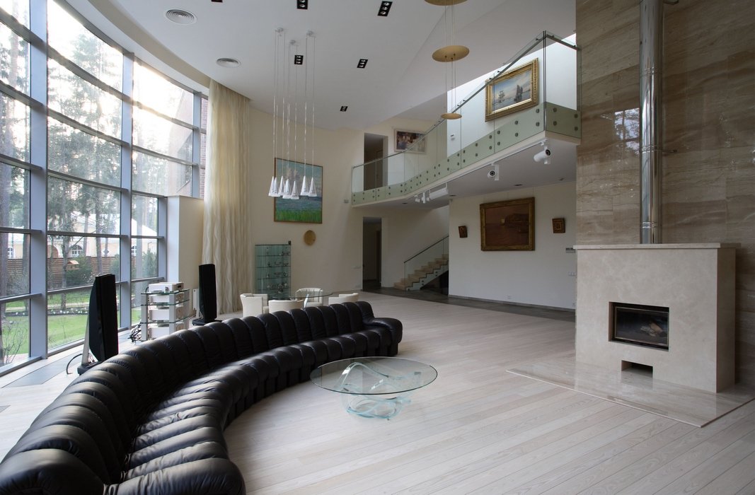 La iluminación de segundo nivel en la casa ayuda a resolver el problema de los techos altos sin el uso de detalles innecesarios. La máxima luz natural hace que la atmósfera general sea más acogedora y cómoda.