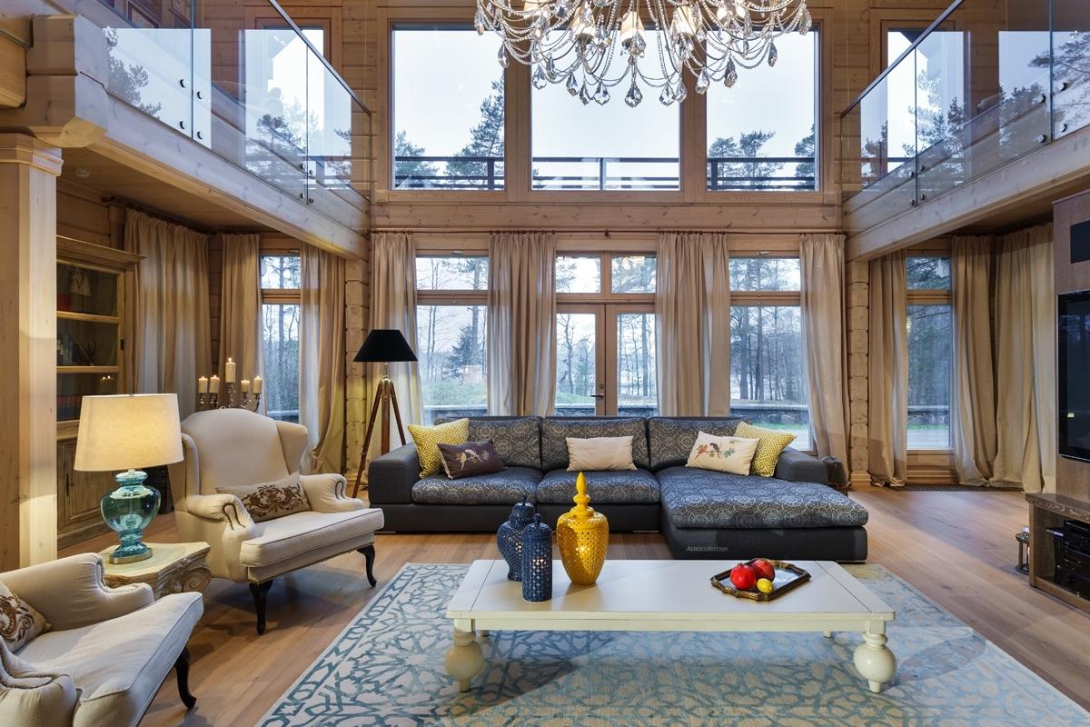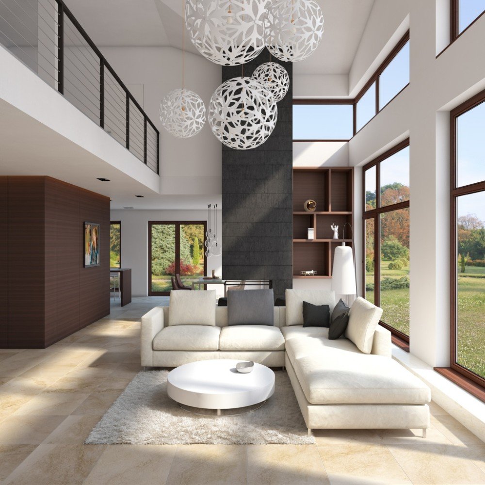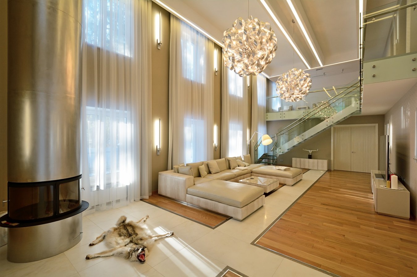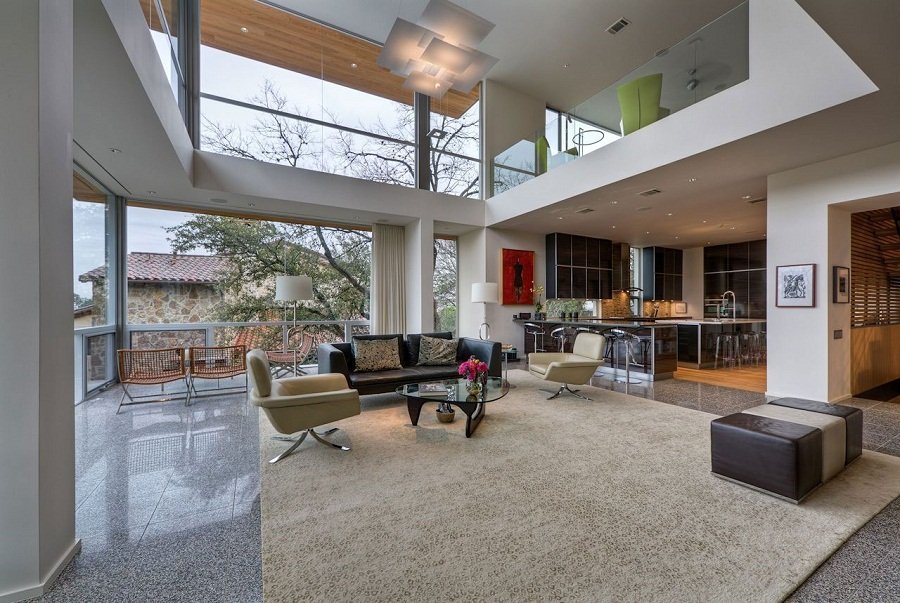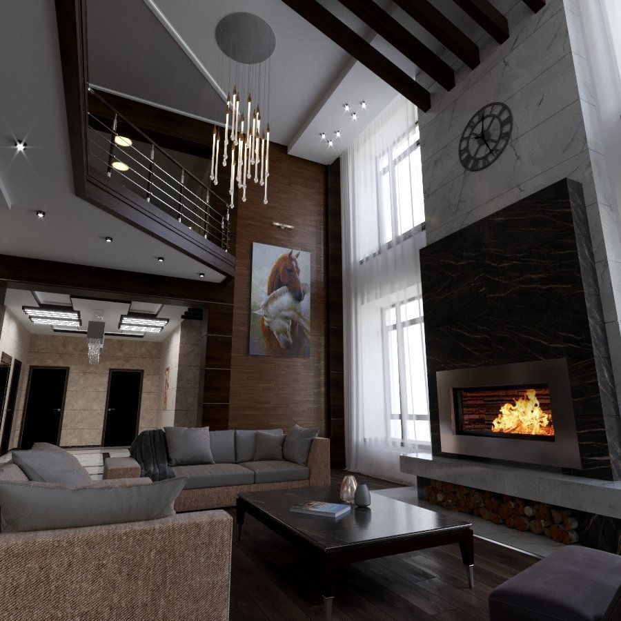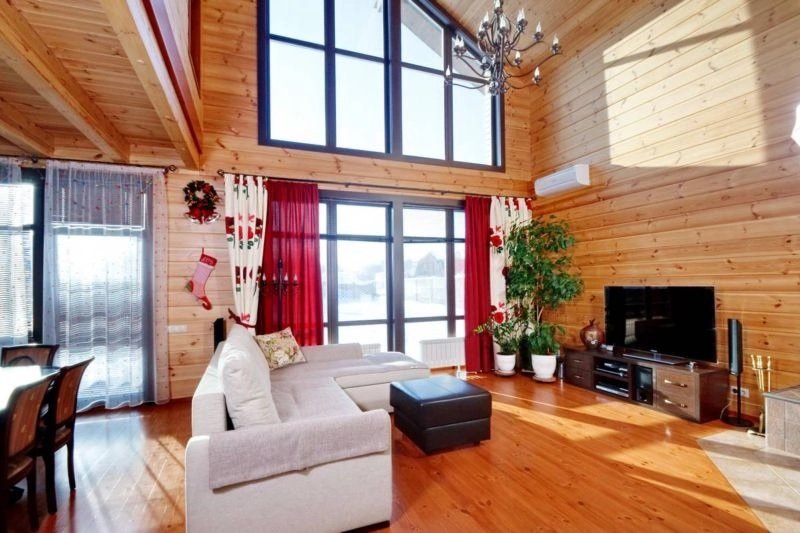 La iluminación de segundo nivel en la casa ayuda a resolver el problema de los techos altos sin el uso de detalles innecesarios. La máxima luz natural hace que la atmósfera general sea más acogedora y cómoda.