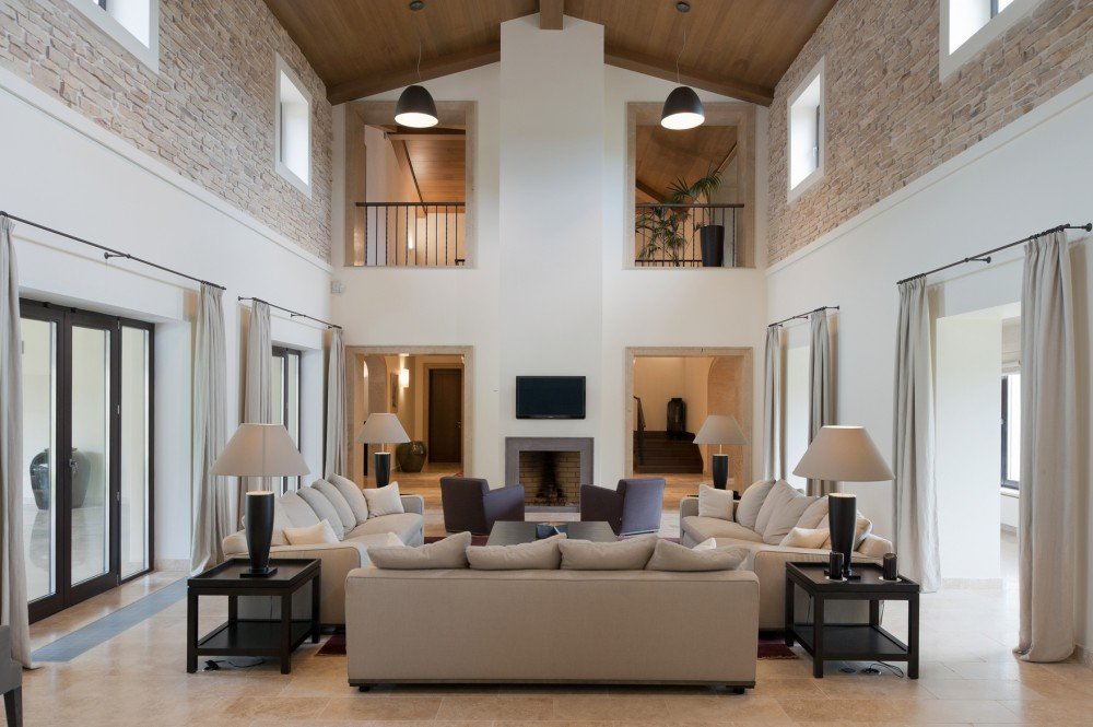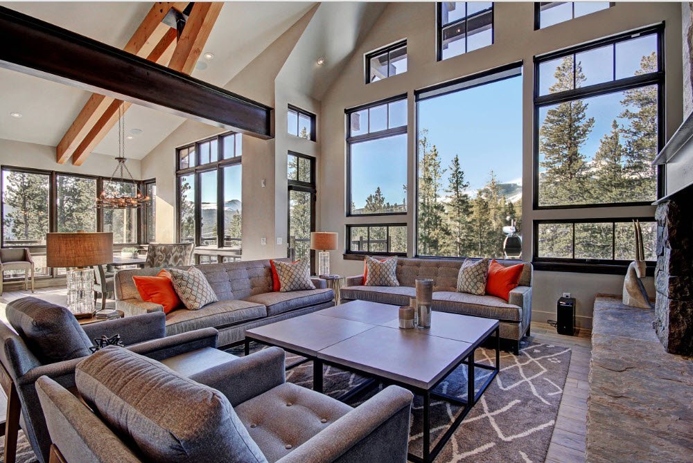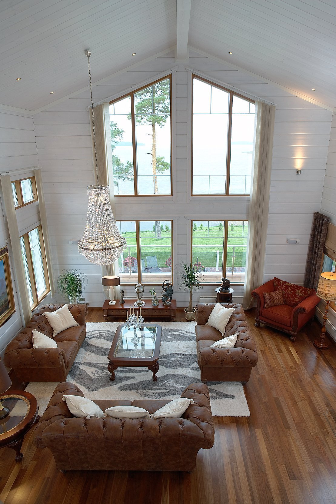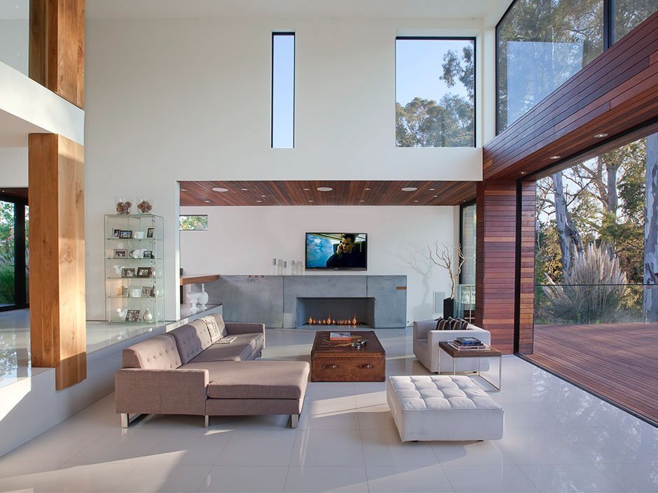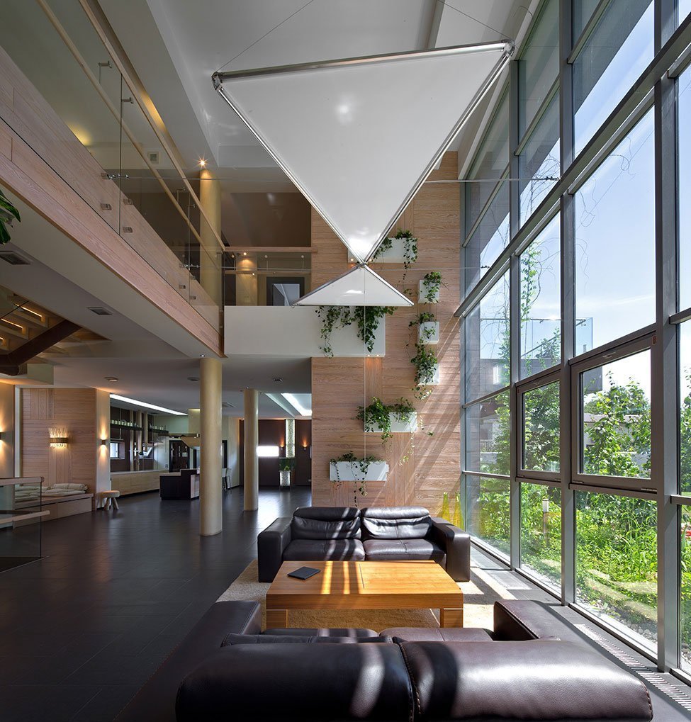 La iluminación de segundo nivel en la casa ayuda a resolver el problema de los techos altos sin el uso de detalles innecesarios. La máxima luz natural hace que la atmósfera general sea más acogedora y cómoda.