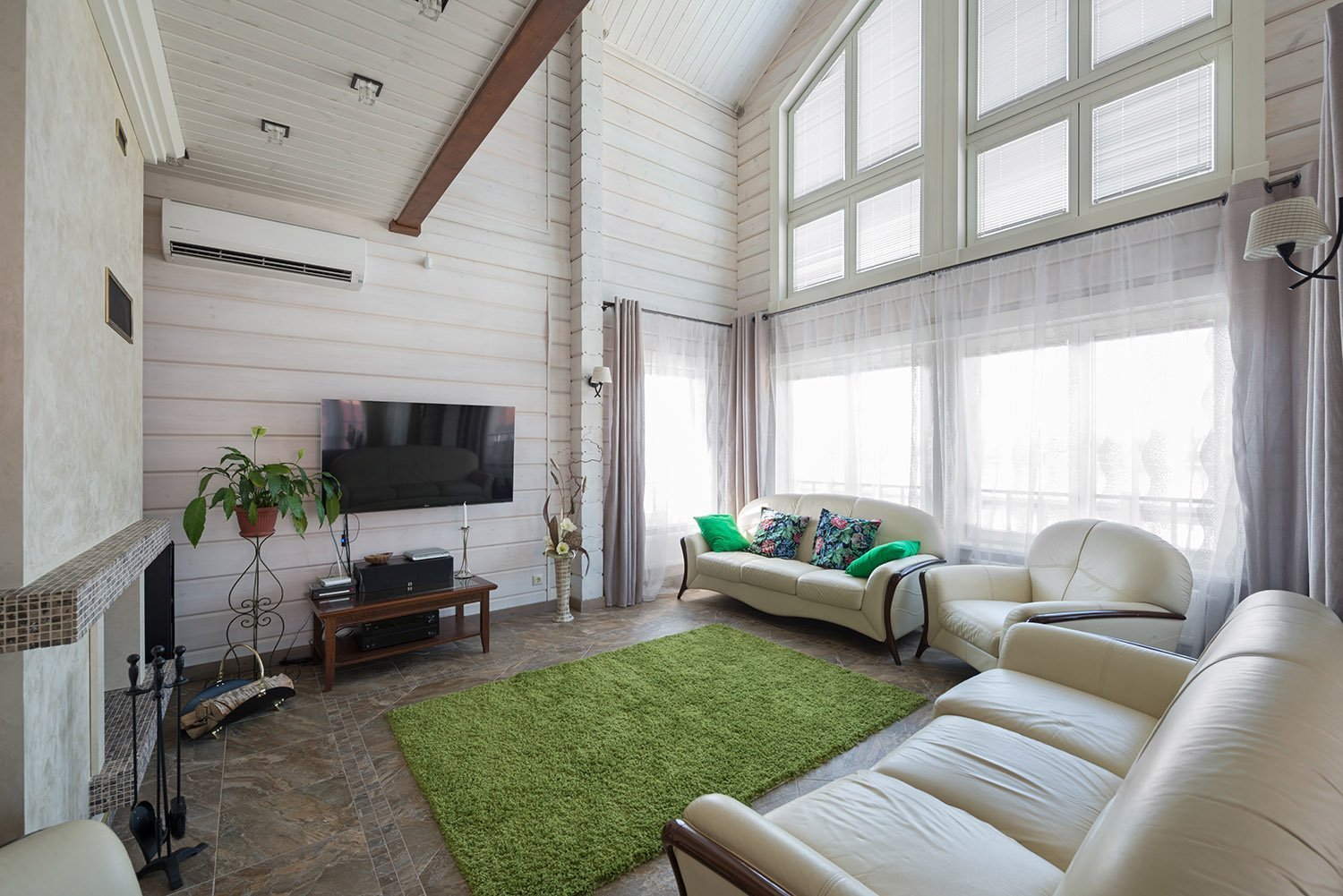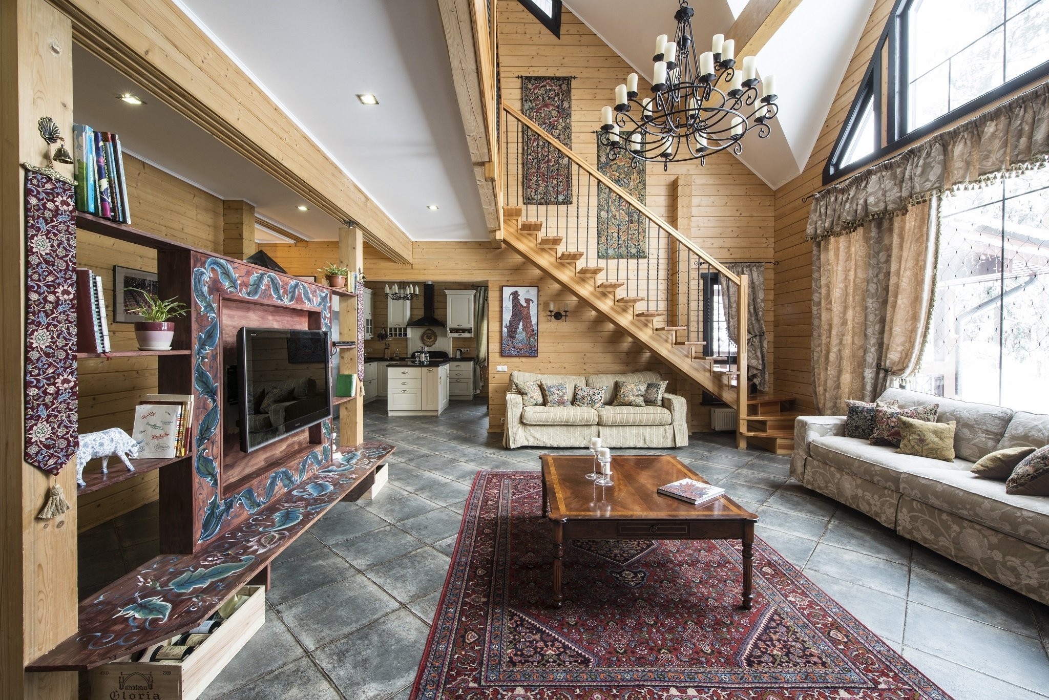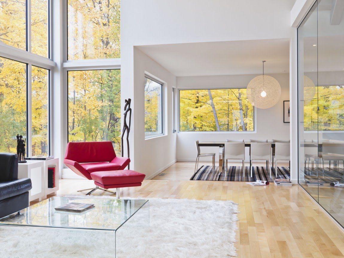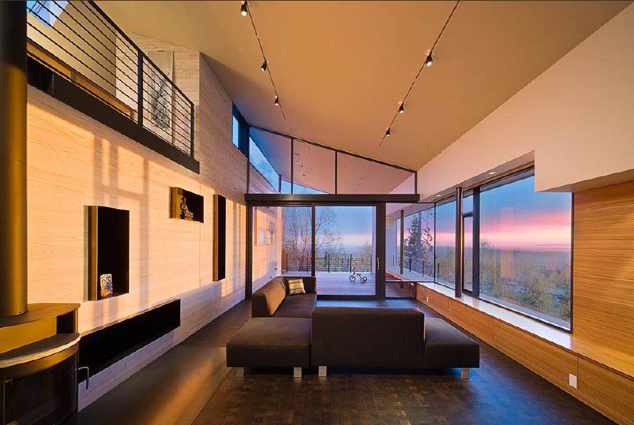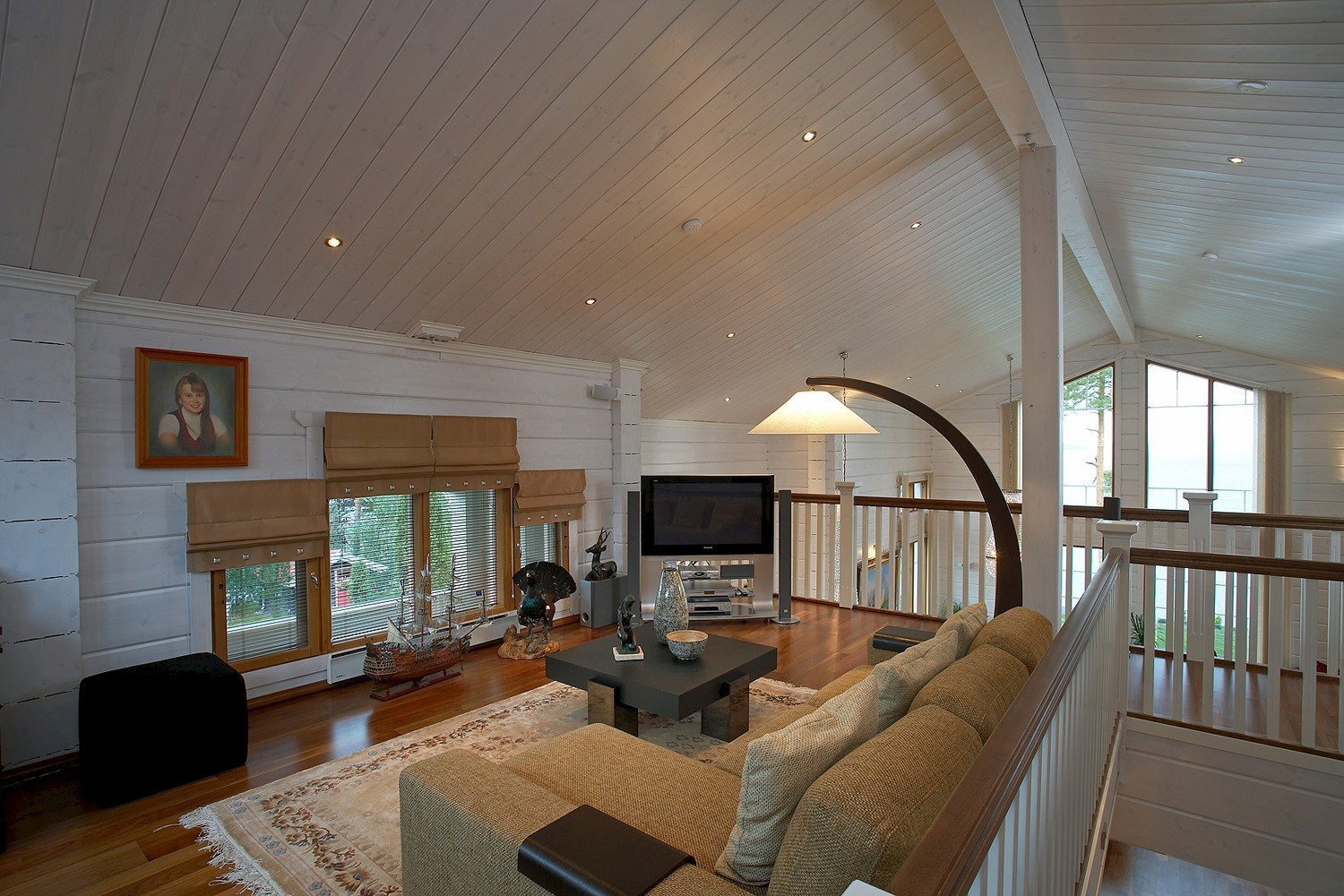 La iluminación de segundo nivel en la casa ayuda a resolver el problema de los techos altos sin el uso de detalles innecesarios. La máxima luz natural hace que la atmósfera general sea más acogedora y cómoda.