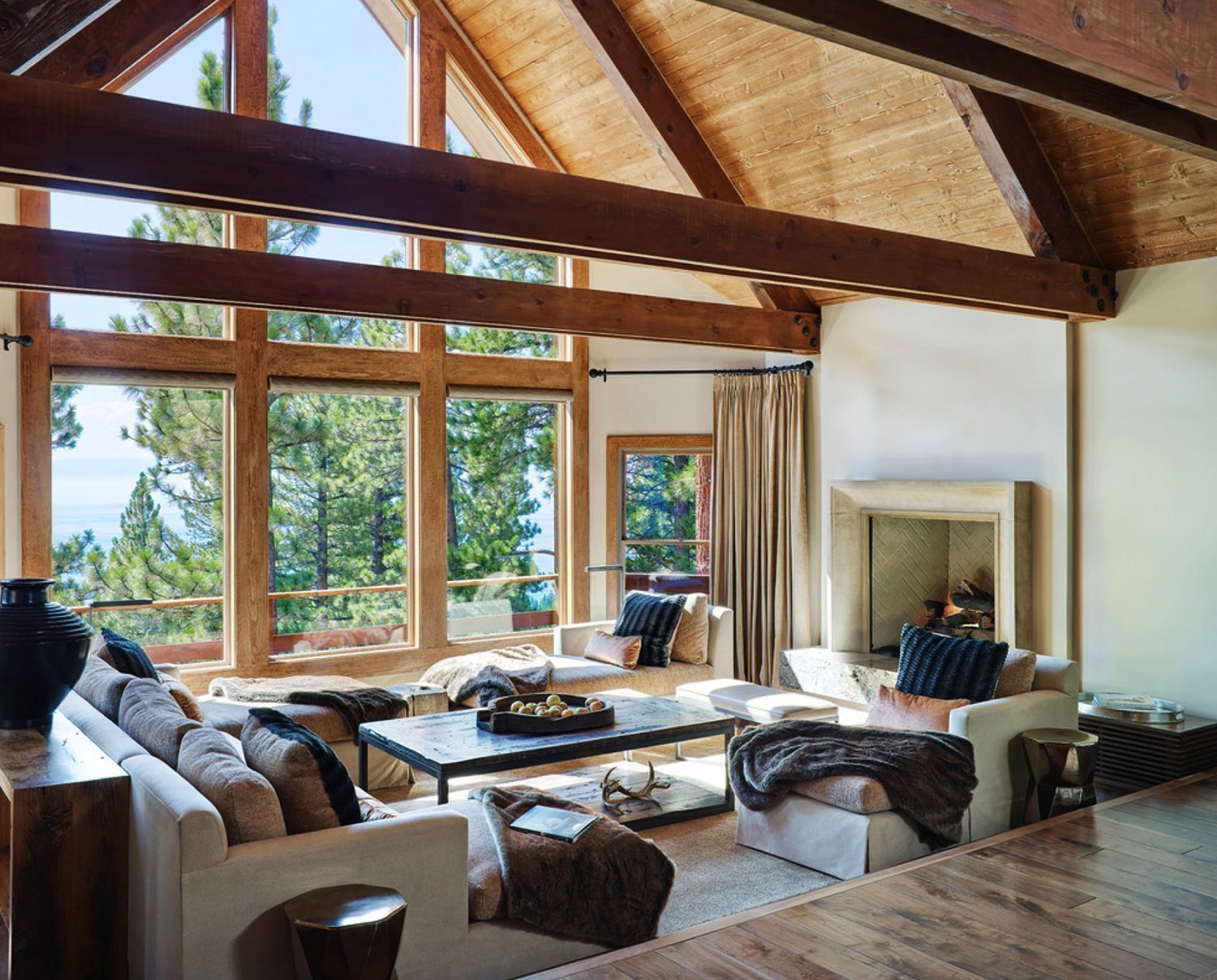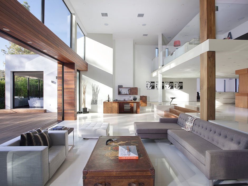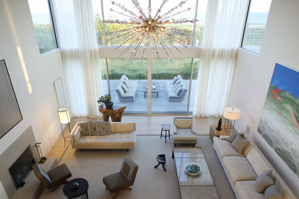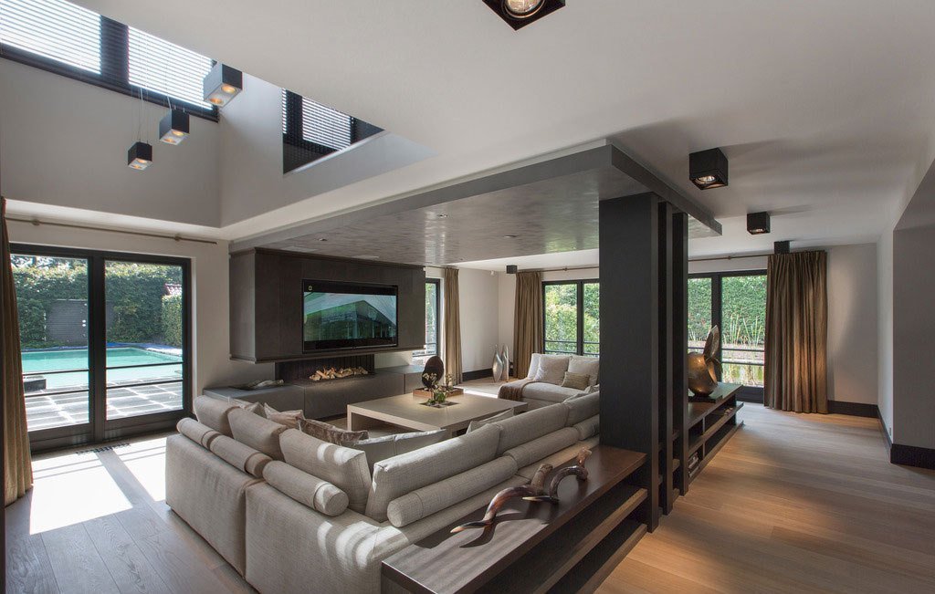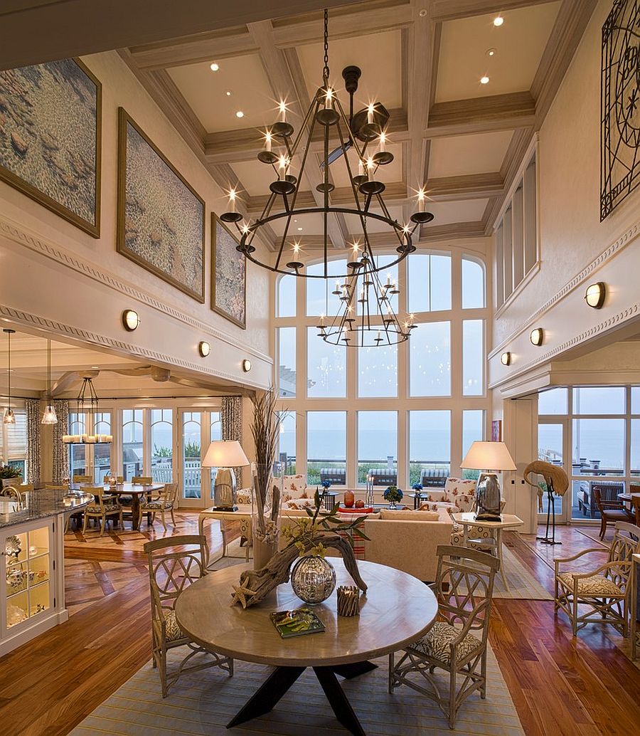 Además de las ventajas obvias, una luz de dos niveles ilumina cada rincón de la habitación y resalta vigas y vigas bellamente diseñadas en las paredes. Ayuda a zonificar el espacio, colocando acentos de luz.