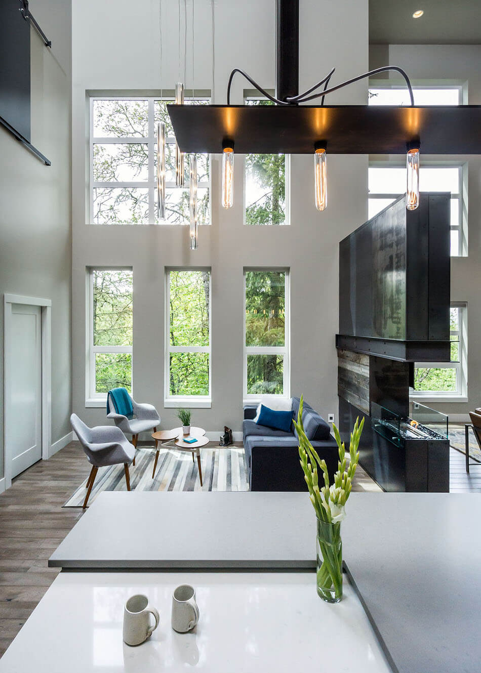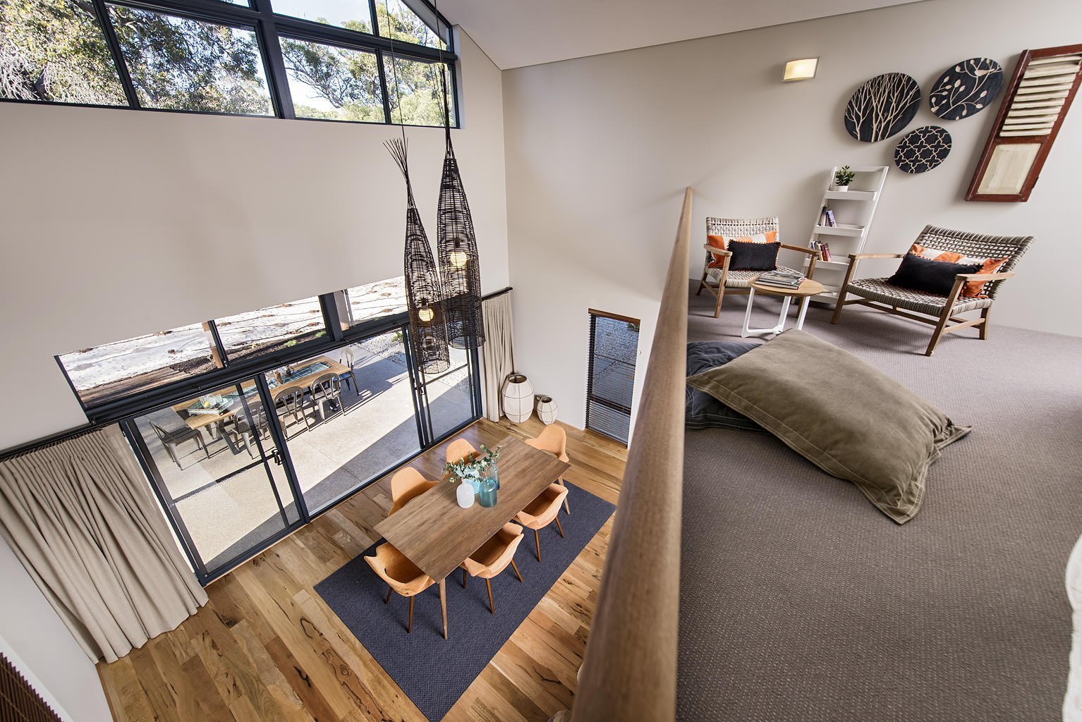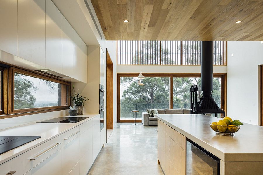 Además de las ventajas obvias, una luz de dos niveles ilumina cada rincón de la habitación y resalta vigas y vigas bellamente diseñadas en las paredes. Ayuda a zonificar el espacio, colocando acentos de luz.