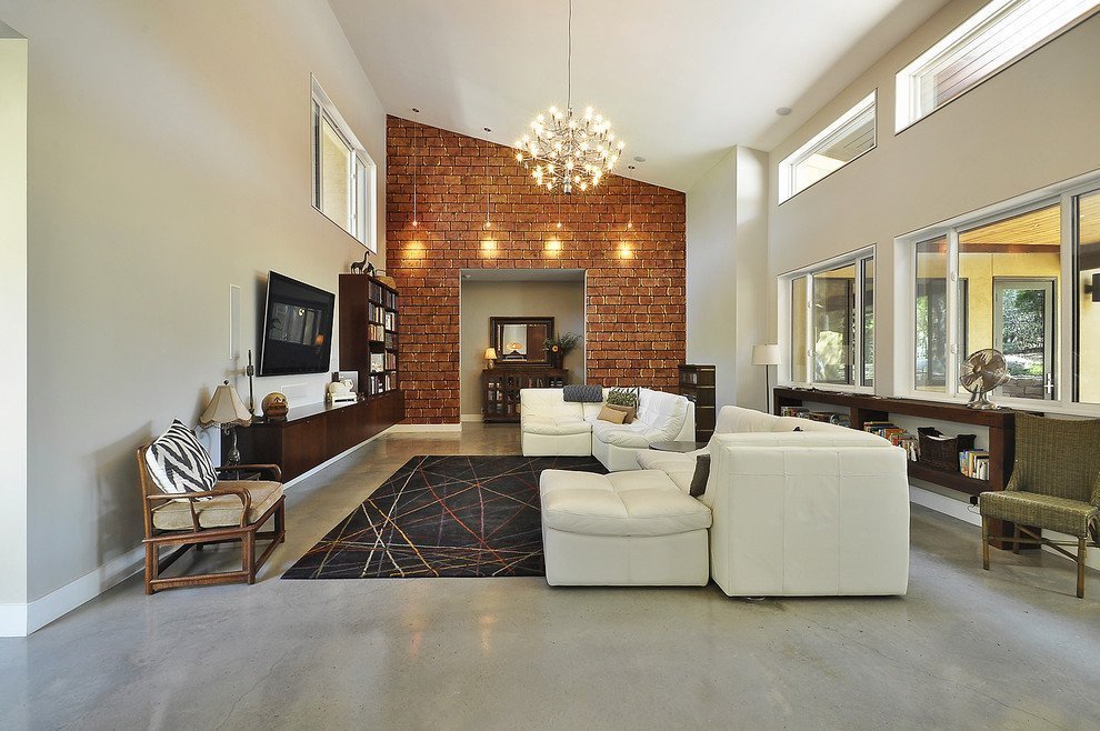 Las lámparas de pared con esta versión de la habitación, donde hay ventanas adicionales, es mejor usar en grupos. Está permitido resaltar el televisor y las imágenes con la ayuda de la tira de LED. Las lámparas de pie instaladas en el medio junto con un sofá y una mesa de café también son buenas en este interior.