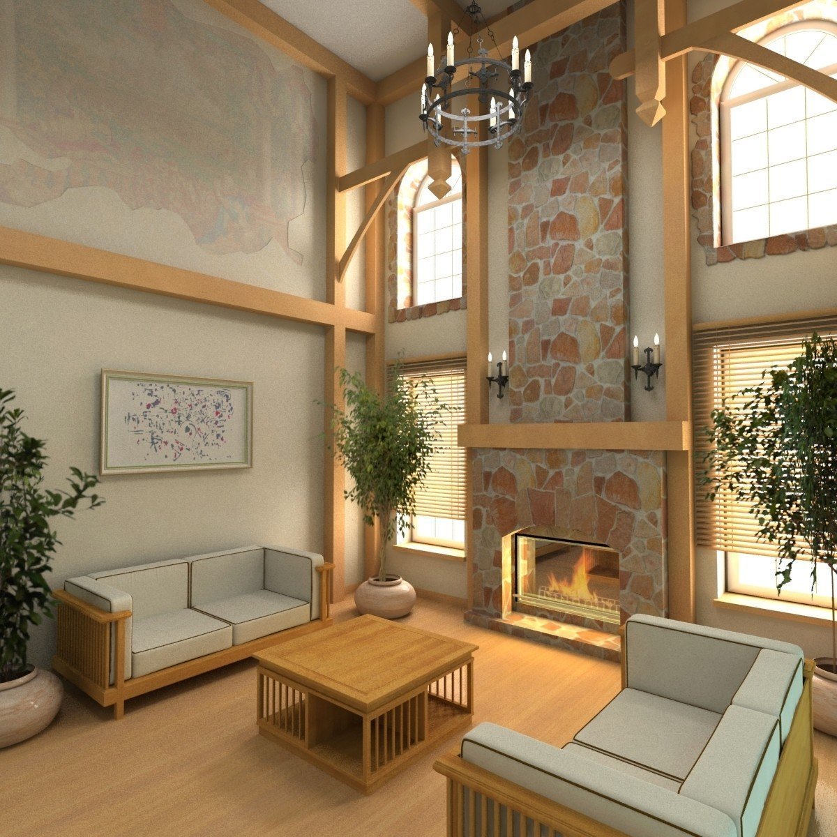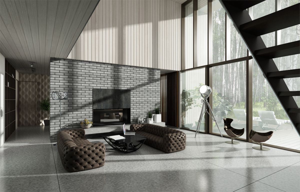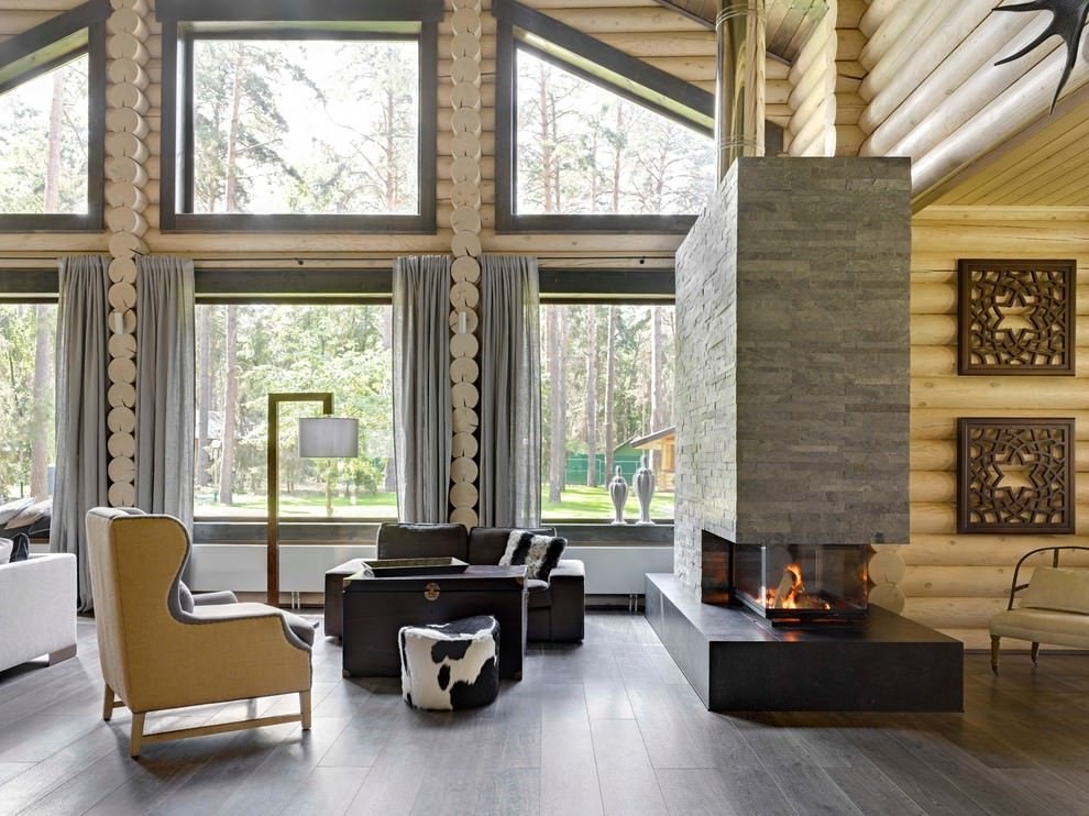 Siempre que sea posible, se coloca una chimenea entre las ventanas centrales o al costado de ellas. Esta posición ayuda a combatir la pérdida de calor y tampoco viola la armonía general del interior.