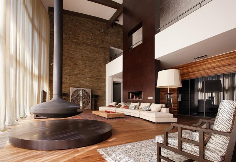 Algunas veces se puede usar una chimenea para zonificación. Luego su pipa corre en el centro de la habitación, y detrás de ella hay una pared estilizada especial.