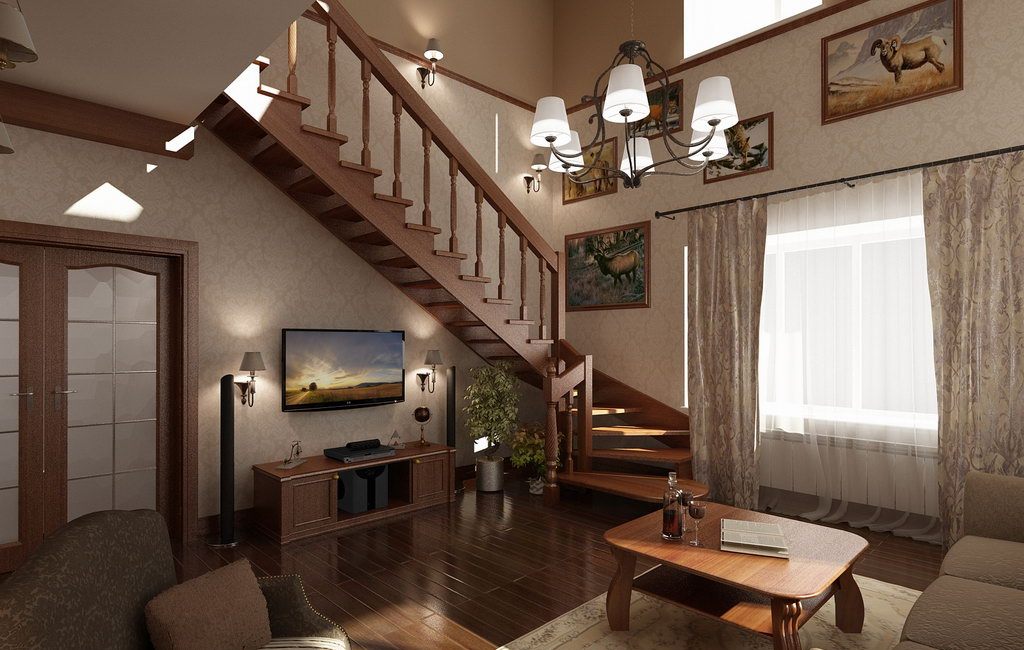 Lo más destacado de la iluminación artificial de la segunda luz está encerrada en una lámpara de araña debajo del techo. De hecho, con techos altos, este detalle siempre se presta atención. Por lo tanto, el candelabro debe reflejar completamente el estilo del concepto interior.