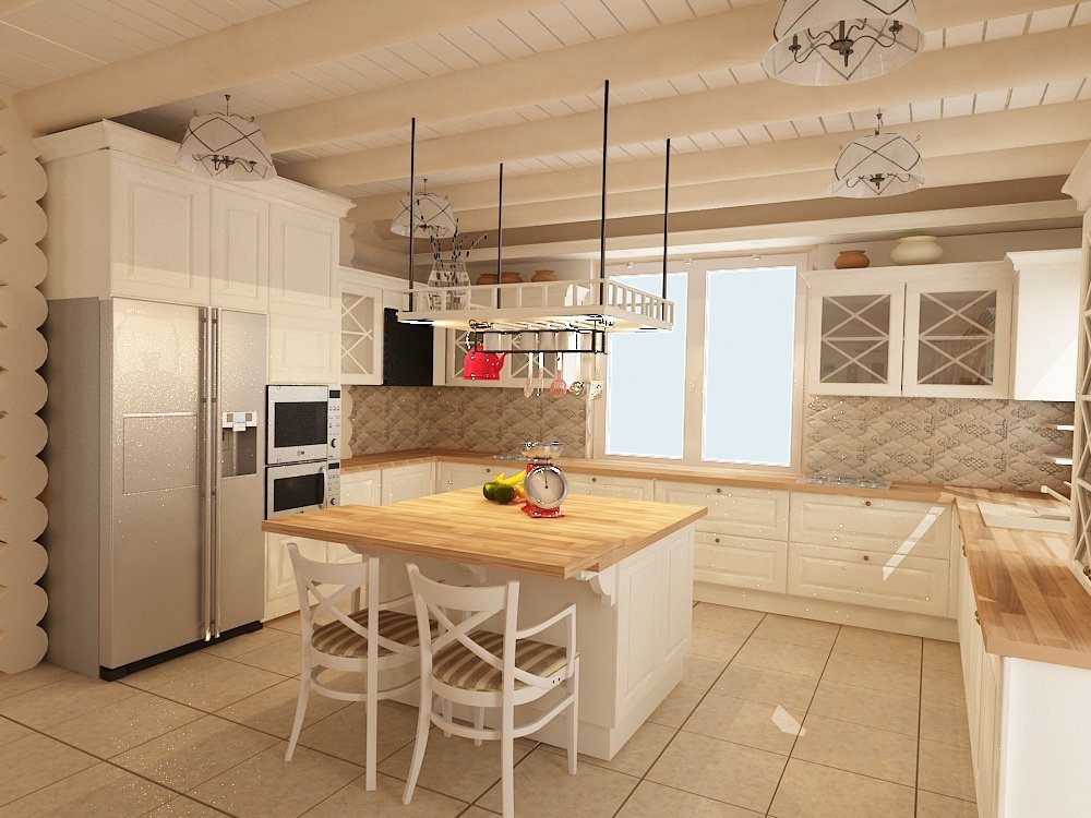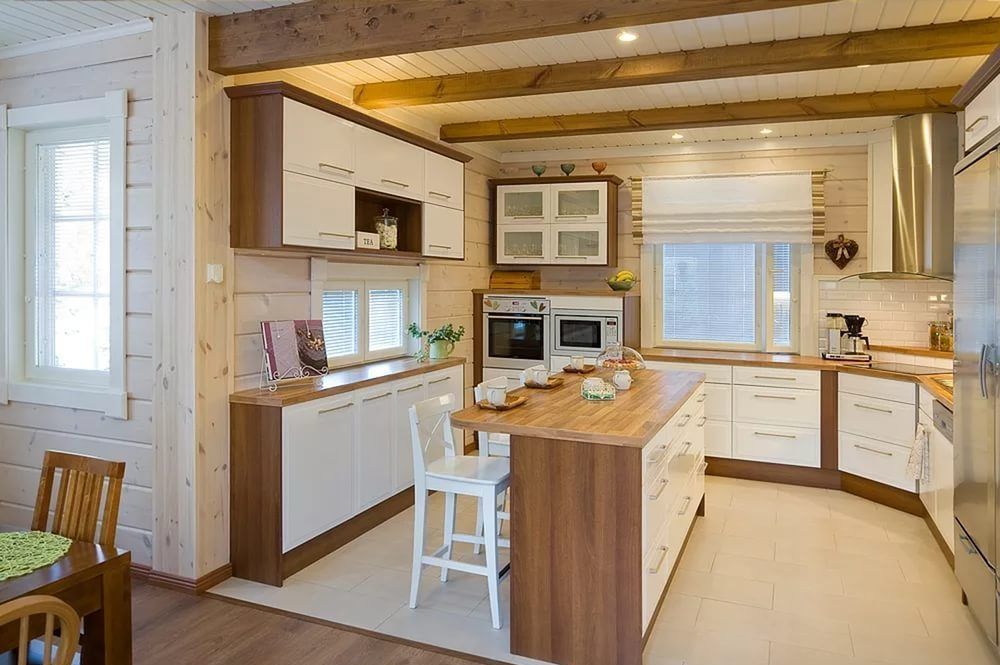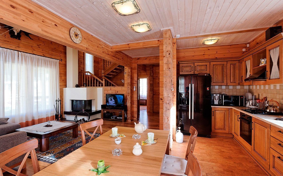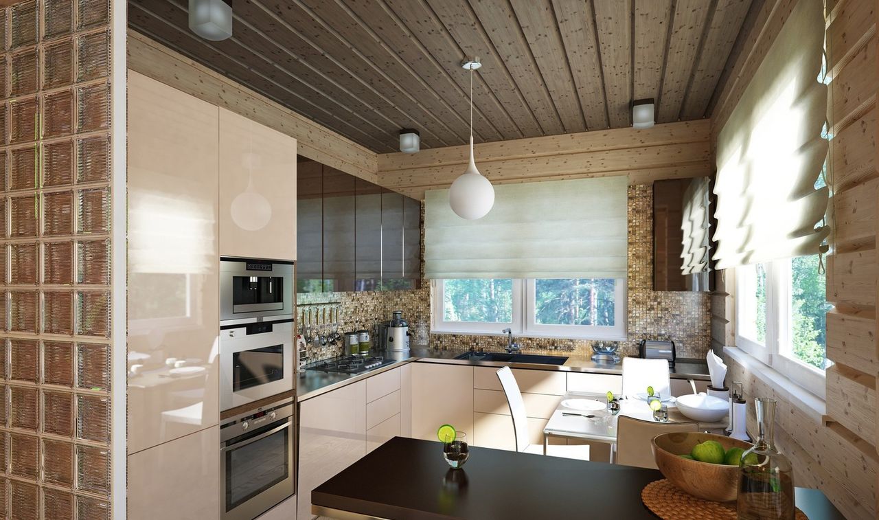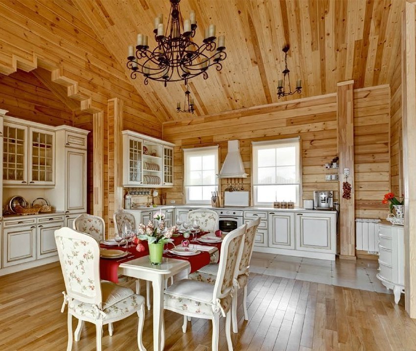 La cocina es, por supuesto, una habitación muy acogedora: saborea carne aromática, se hornean pasteles increíbles, se prepara café fuerte. Pero todas estas acciones implican un desorden creativo, salpicaduras, de las cuales es tan importante proteger los paneles de madera de las paredes y el piso. Para apoyar la decisión de estilo, puede colocar un delantal con un azulejo que imite la textura de un árbol, incluso un tablero laminado o plástico es adecuado. El área de trabajo de piedra se adapta perfectamente al estilo natural de la cocina. No se olvide de la campana, si desea mantener los techos en su forma original.
