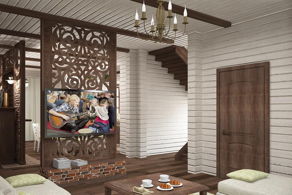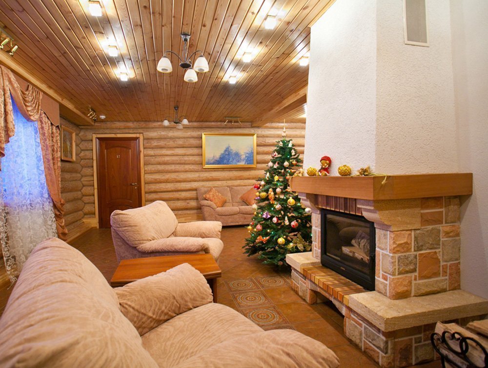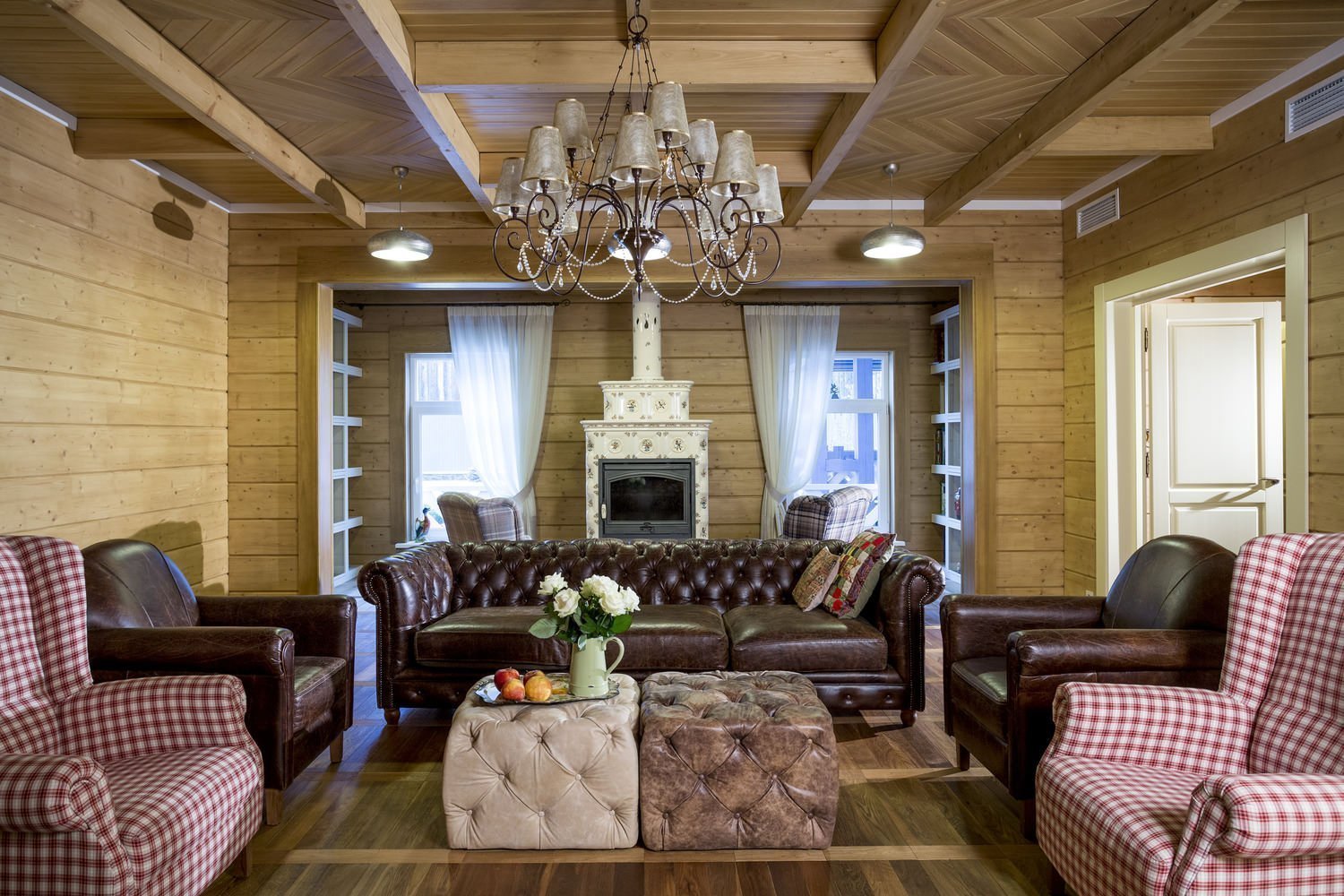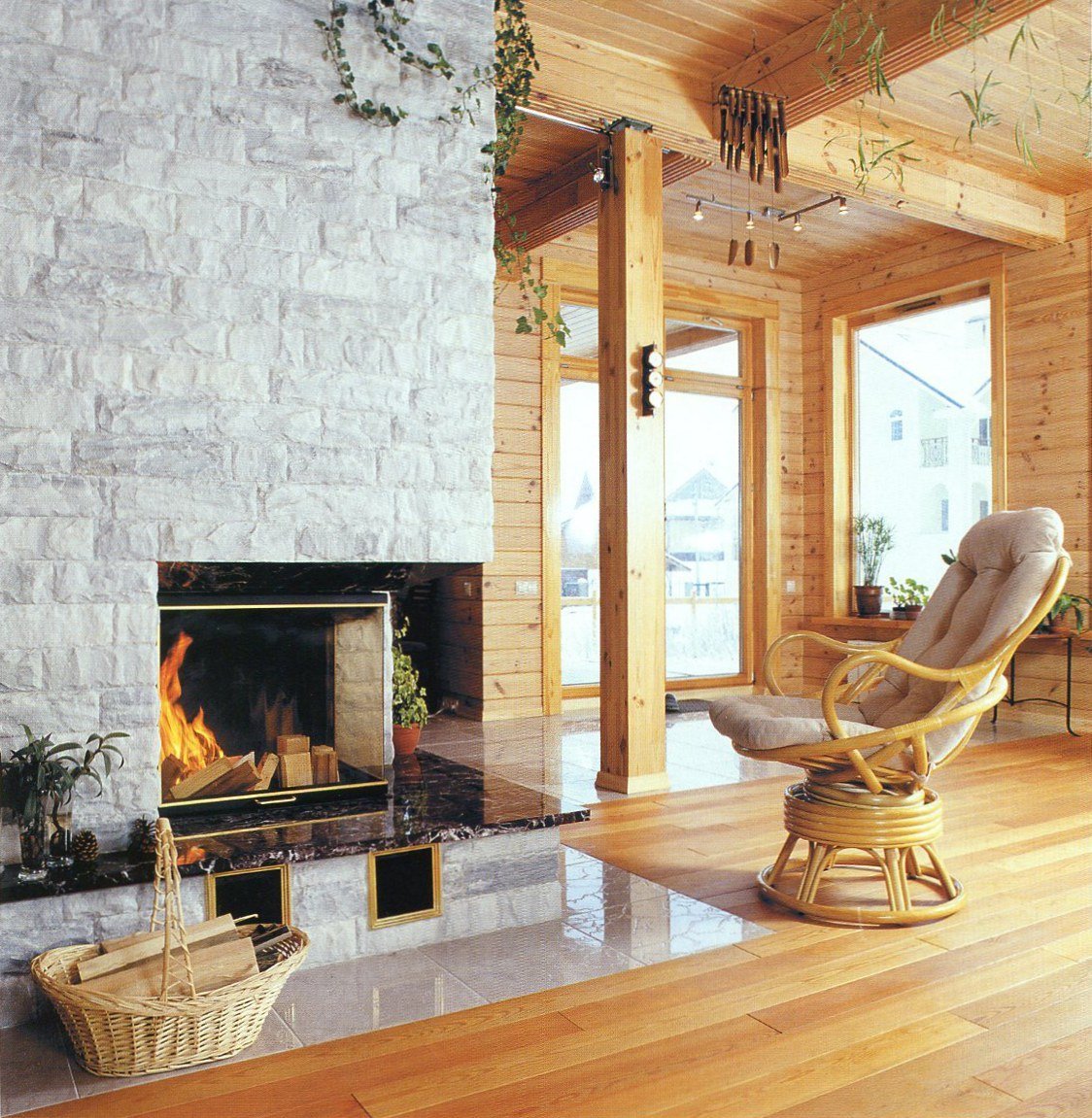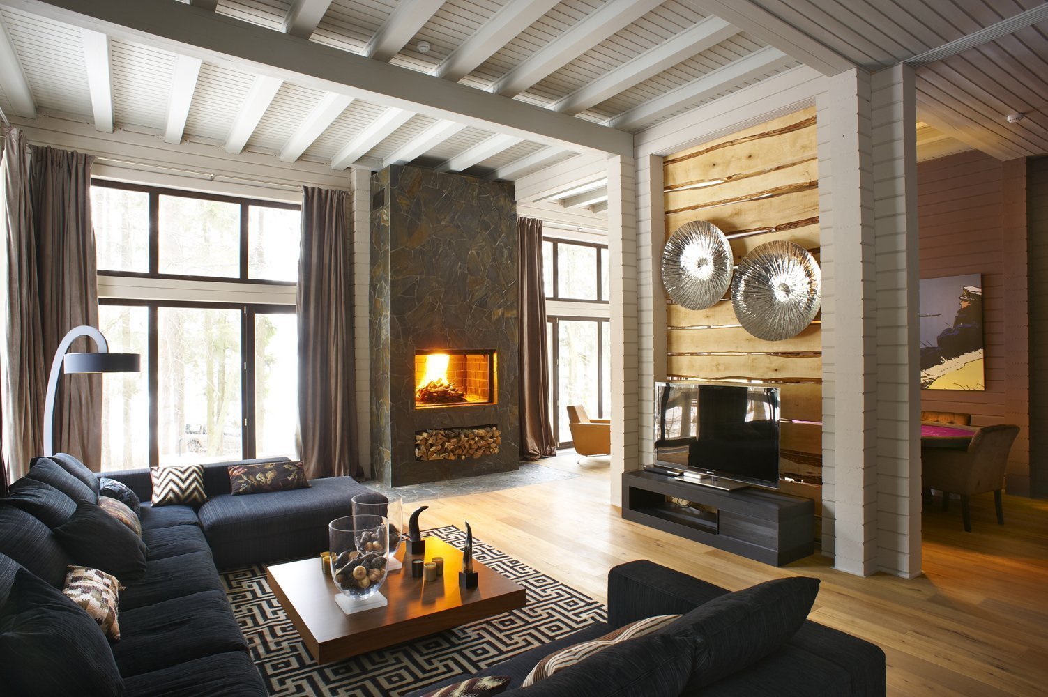 La chimenea se convierte en el elemento principal de la sala de estar, y su decoración con piedra o ladrillo se suaviza con alfombras y cojines de sofá, alfombras. Si no hay chimenea, la disposición de los muebles depende de las preferencias, el ocio familiar.
