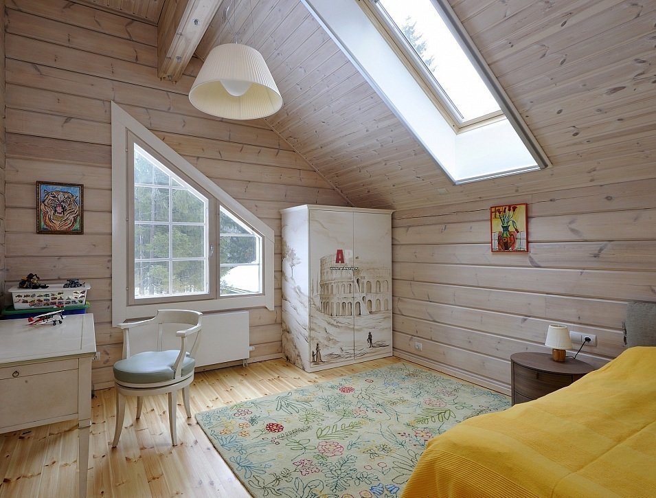 las paredes y los techos se minimizan: la madera sin procesar lacada se ve más cómoda. La pared pintada también se ve bien;