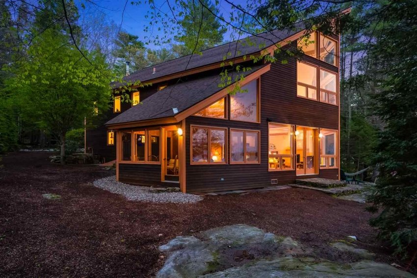 El diseño elegante y original es conveniente y fácil de diseñar. Dicha casa se puede vincular con cualquier relieve y diseño de paisaje. En el piso del ático bajo un techo asimétrico, es conveniente instalar equipos tecnológicos: ventilación, sistemas de calefacción, paneles solares. Los siguientes tipos de techos son populares: