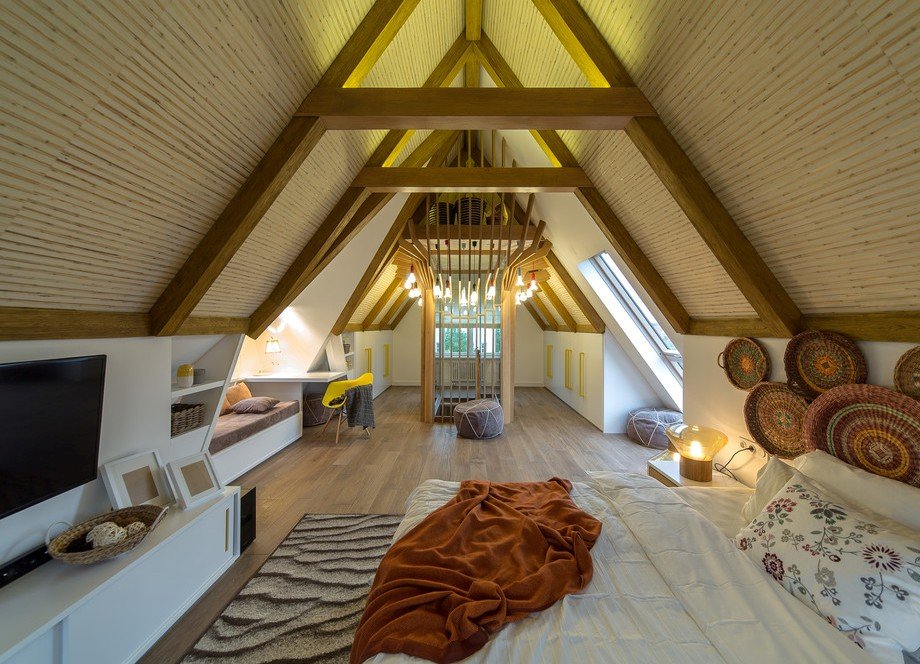 El diseño interior del ático dependerá del propósito de la habitación. Si la casa está construida de madera, el interior debe estar hecho del mismo material. El estilo ecológico es la opción más ganadora. Convierte un ático simple en cualquier habitación. Desde el piso superior obtendrá un estudio bien iluminado, un amplio vestidor, una sala de relajación, una sala de juegos para niños.