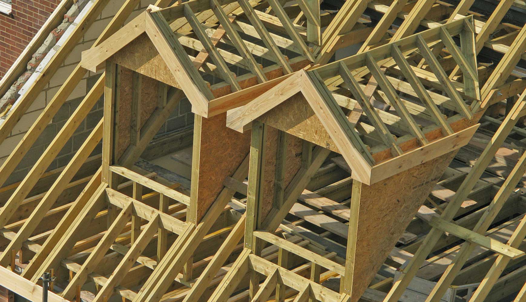 La secuencia de construcción del techo en forma de L diferirá según el ancho de los frontones y su correspondencia entre sí. El sistema de construcción consta de dos techos a dos aguas que chocan entre sí. Están conectados en un ángulo de 90 ° C en la unidad más compleja.