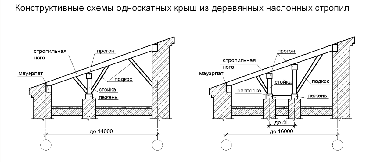 Un dispositivo de techo simple debido a la falta de una cresta y las dificultades con su disposición. Dichos diseños tienen un aspecto no estándar. Mauerlat se monta en paredes opuestas de diferentes alturas y las vigas son fijas, se forma un bisel con un ángulo de inclinación de 30-45 ° С. Es imposible hacerlo más pequeño, ya que pueden surgir dificultades con la salida de nieve y agua de lluvia, lo que conducirá a una carga adicional en los soportes.