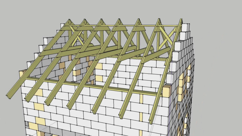 Los troncos caídos se colocan a lo largo del tramo con un intervalo de 0,5 m, en ambos lados se unen al Mauerlat utilizando tornillos autorroscantes y esquinas metálicas.