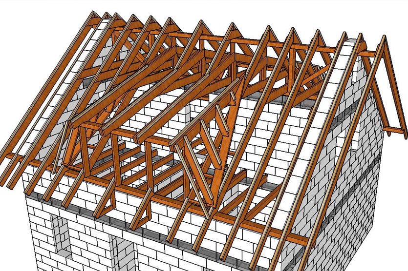 Es mejor instalar las estructuras en una casa cuya distancia entre las paredes laterales no exceda los 6 m. En este caso, se construye la armadura más simple, que consta de dos vigas conectadas desde arriba en cierto ángulo. Inferior horizontalmente, se ve reforzada por bocanadas que consisten en vigas de madera. Para estos fines, también puede usar barras de perfil de metal, que se denominan pesadas. Tal dispositivo puede reducir la carga espaciadora en los puntos de referencia.