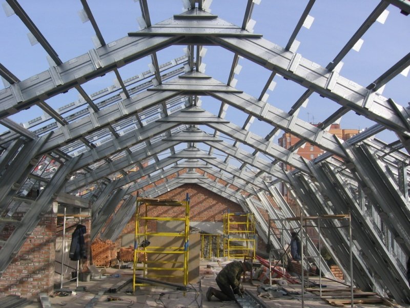 Además, para la construcción de una estructura privada, se utiliza metal. La mayoría de las veces recurren a él si es necesario para organizar una superposición de una longitud de 10 metros o más. En este caso, la viga de madera se reemplaza por una tubería de perfil. La conexión de los elementos se realiza mediante soldadura. Hay opciones combinadas cuando la cama, Mauerlat, la cresta, los bastidores están hechos de metal, todas las demás partes están hechas de madera.