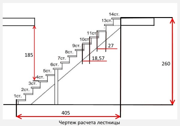 La altura de los techos es una constante. Está determinado por el diseño del edificio. Los valores restantes se pueden ajustar al tamaño deseado. Para calcular el número de pasos, es necesario dividir la altura del techo por la longitud de los pasos.
