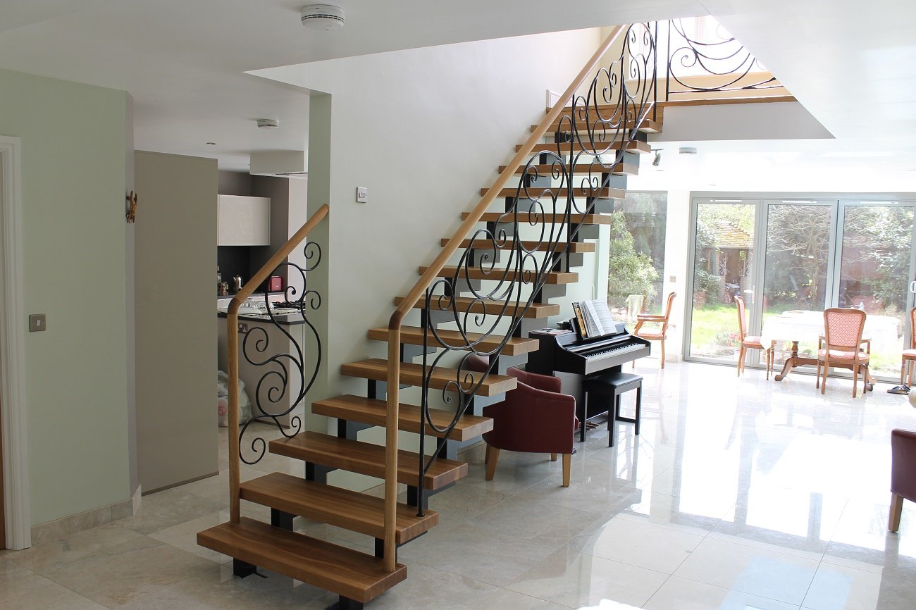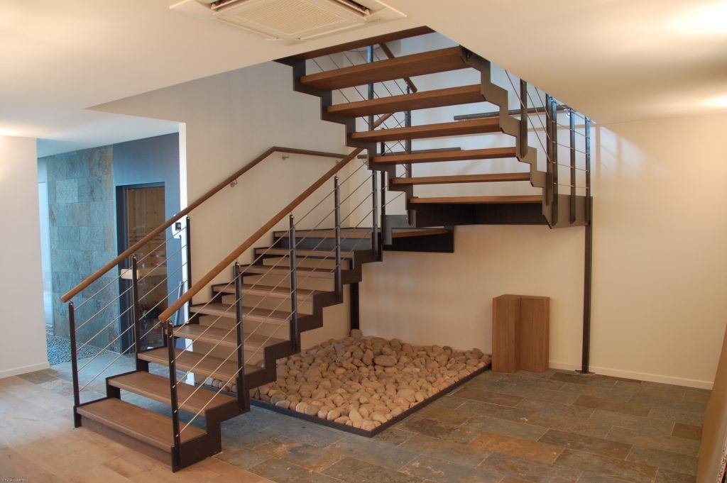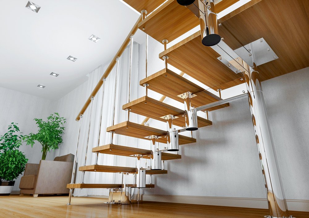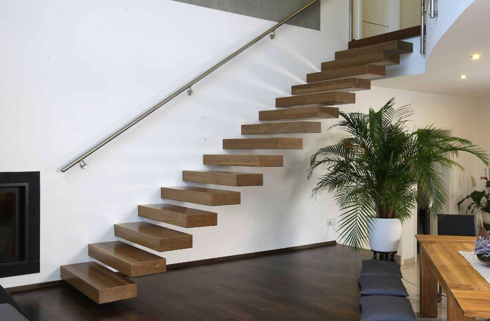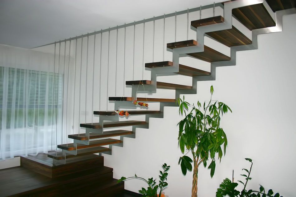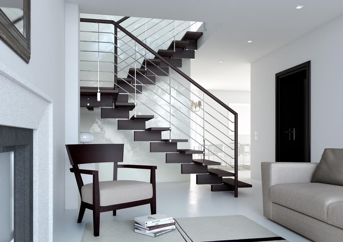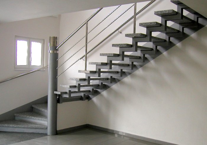 Diseño más complejo que las opciones anteriores. No incluye vigas de soporte. Los escalones están montados en un marco de metal espacial. La construcción se lleva a cabo en varias etapas. Primero, la base de hierro se ensambla y se une a la pared. Se elige el tipo de sujetadores para el material de las superficies verticales. El siguiente paso será la instalación de pasos y pasos, terminando con el material seleccionado. En la etapa final, se instala una cerca a lo largo de la pared del zócalo.