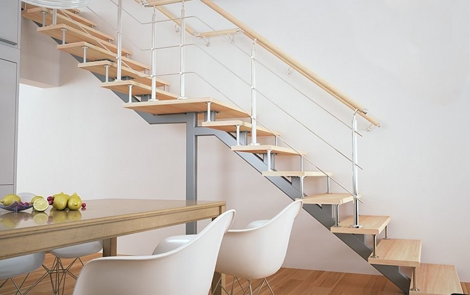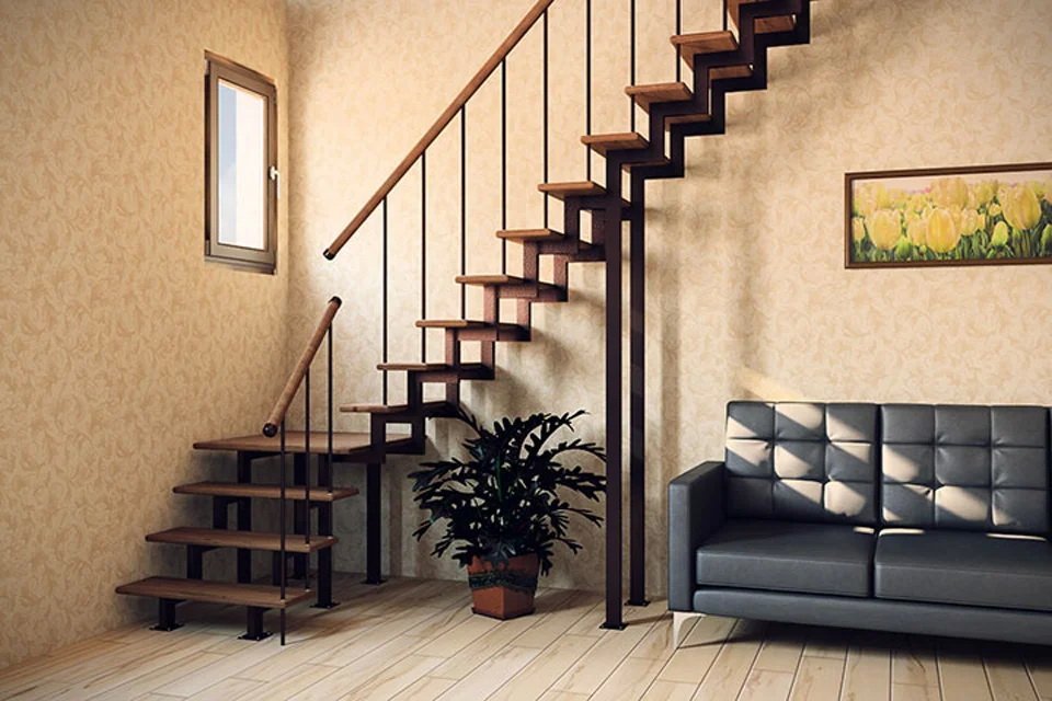 Módulo a módulo. El kosour está montado a partir de varios elementos, cubierto con placas y retorcido con tornillos de bloqueo. Cuando se ensambla, dicha escalera tendrá una curvatura notable que no se puede arreglar. Debido al debilitamiento de los elementos, existe el riesgo de una caída rápida de la estructura.