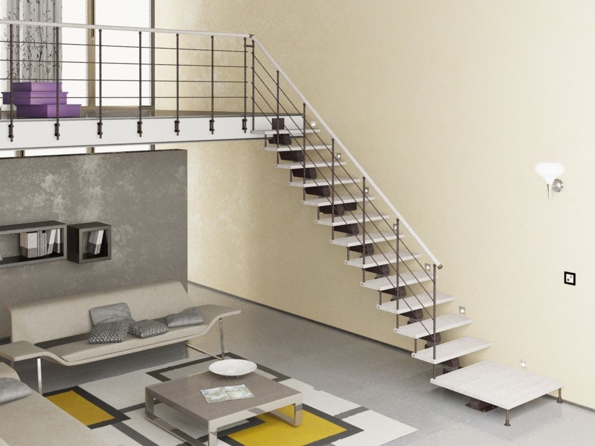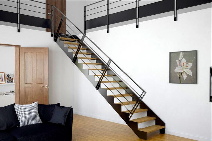 La versión más simple de las escaleras es un perfil fijo entre dos pisos sin giros. La base del diseño rectilíneo consiste en dos vigas idénticas ubicadas paralelas entre sí. Fije elementos a los pisos de los pisos inferior y superior.