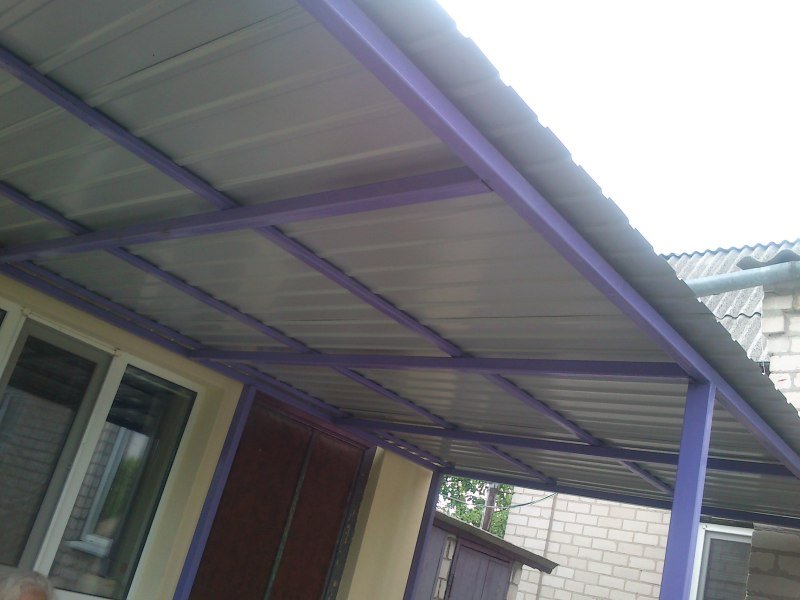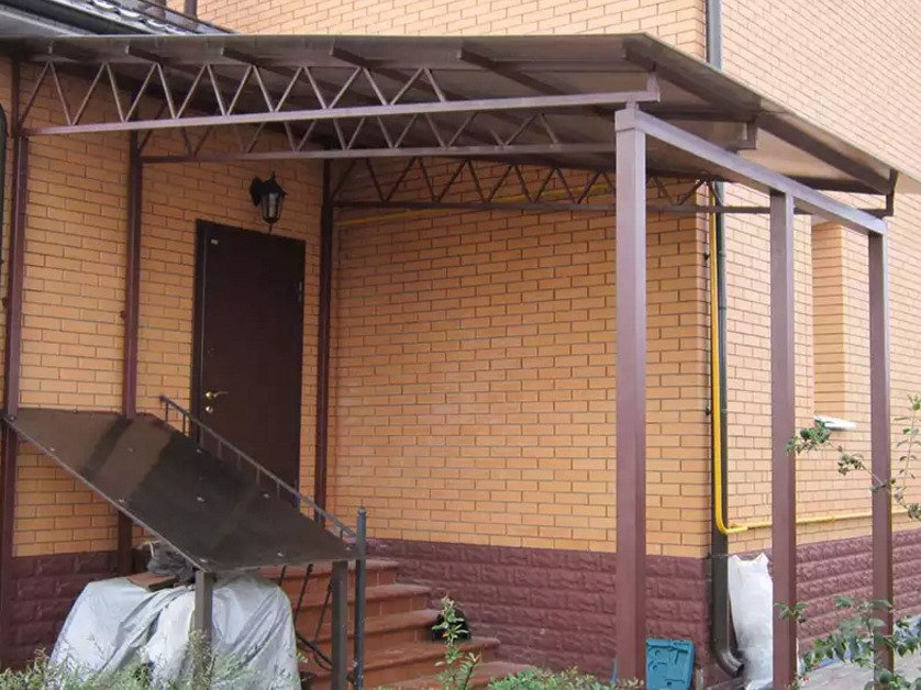 Voladizo. Usando colgantes especiales, la estructura se fija directamente a la pared. Para reducir la presión en la fachada de la casa, use materiales livianos para la fabricación de toldos, que sirven como protección de ventanas y puertas contra la precipitación atmosférica.
