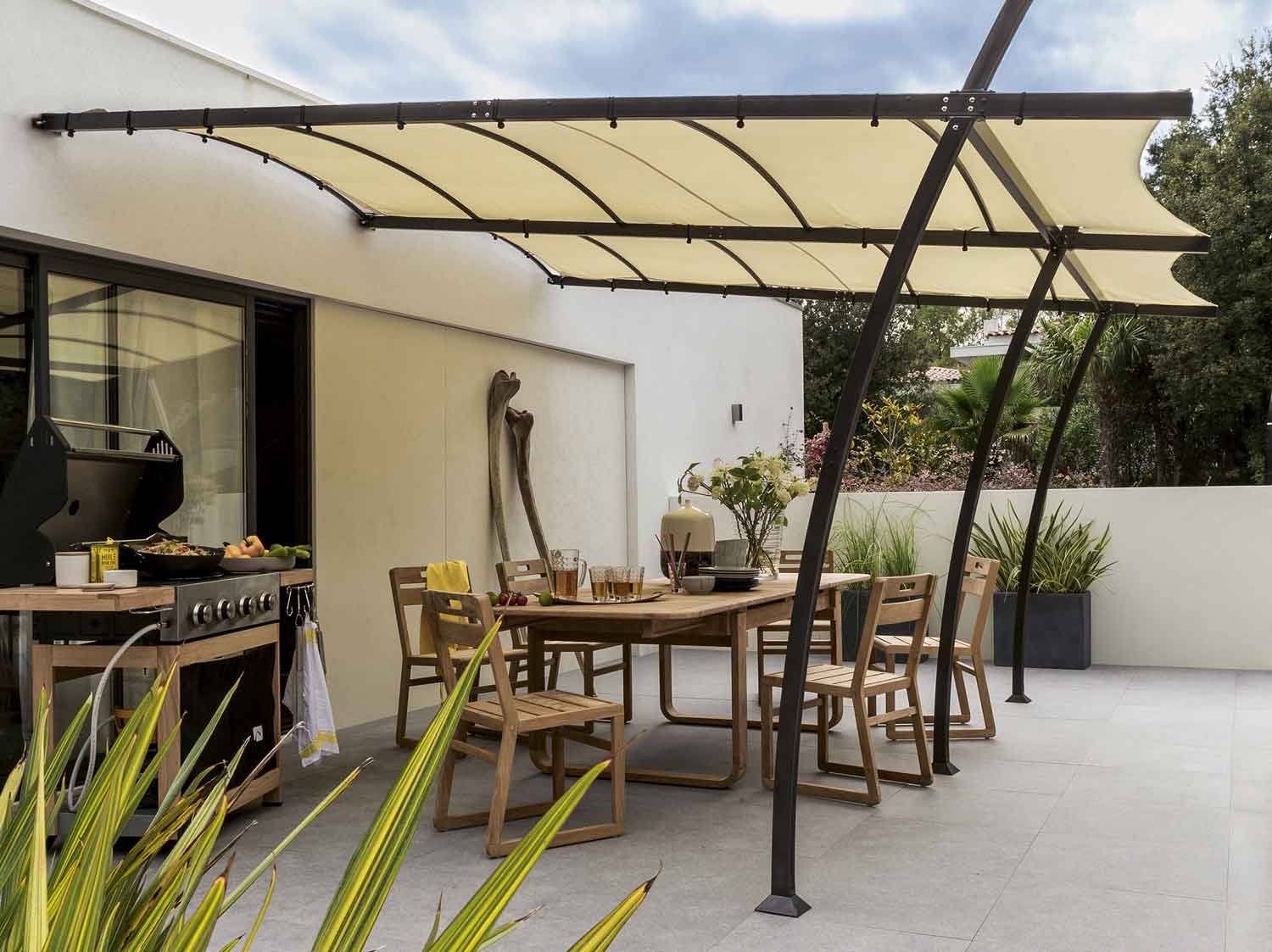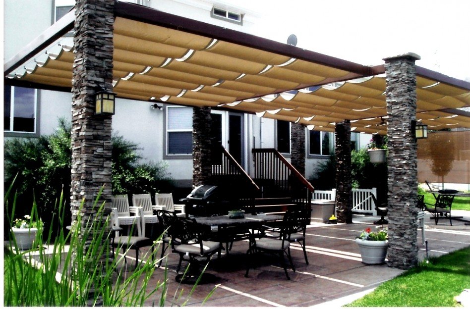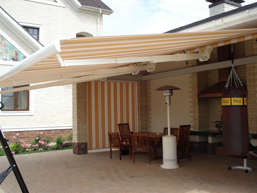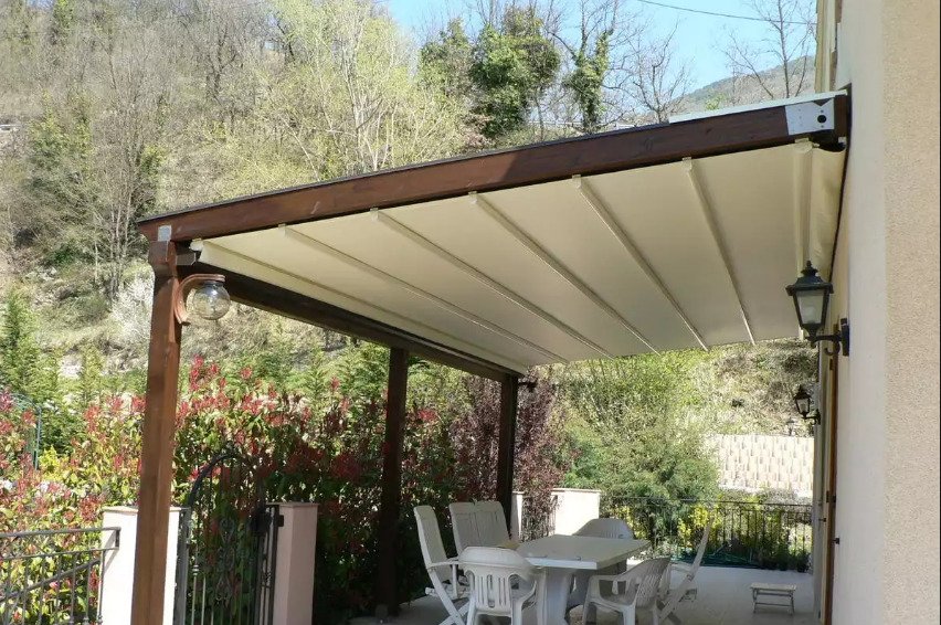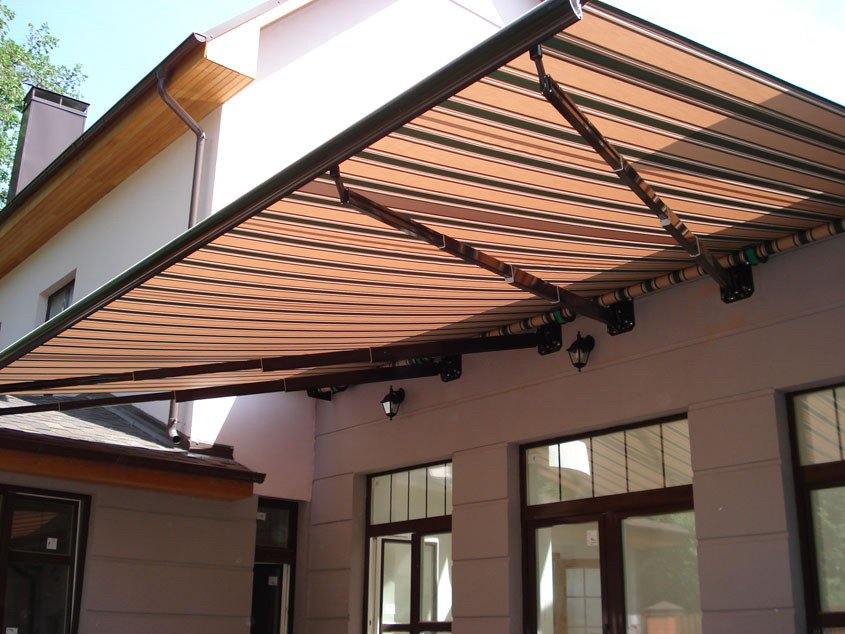 Tela. Para coser y abrigar viseras, las marquesinas usan diferentes materiales de tela. Es necesario que la tela no solo cubra del sol, sino que también la proteja de la lluvia. Hay varios de ellos:
