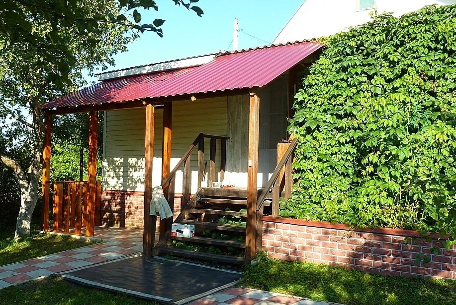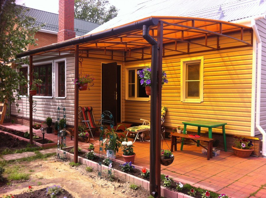 La función protectora del dosel es muy importante, pero también es importante su ubicación y compatibilidad con el diseño de la estructura. Si aún no se ha construido una casa de verano, una casa de campo, también ubicada en la ciudad, en este caso la cubierta se instala por separado de la estructura que se está construyendo. Es bueno unir la estructura a la fachada de la casa, directamente contra su pared.