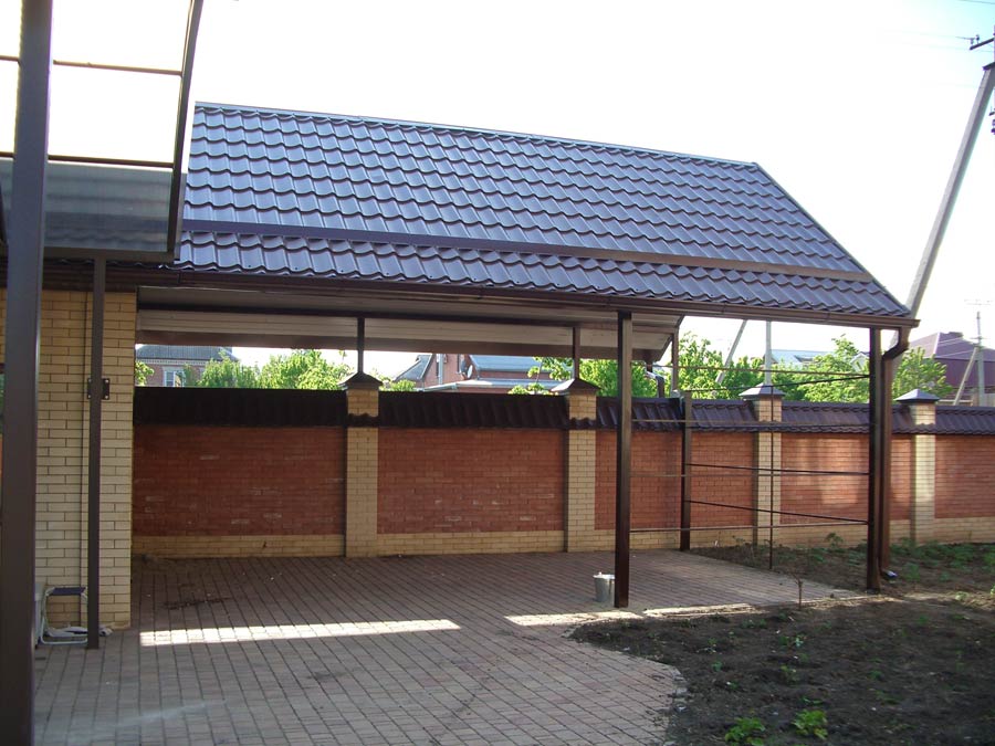 Si el tamaño de la parcela lo permite, se da preferencia a un dosel con un área más grande debajo de la cual se pueden colocar varios automóviles. Esto resolverá el problema con los familiares que llegaron en automóvil en una visita, la presencia de una familia de varios automóviles. Al elegir el lado de la fachada, el lado ventoso, se tienen en cuenta las diferencias arquitectónicas de la casa, a veces su diseño no permite instalar la estructura en el lado frontal.