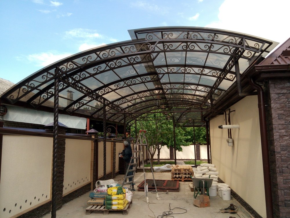 Construya una base, erija un marco, cubra el dosel con material para techos: todas las acciones se pueden hacer con sus propias manos.La gran selección de materiales de construcción que ofrecen los fabricantes le permite crear una visera para el hogar, un dosel para todos los gustos. Si lo desea, puede instalar una forma recta y curva del techo, usar un árbol, una tubería profesional como soporte de apoyo. Crea la decoración necesaria.