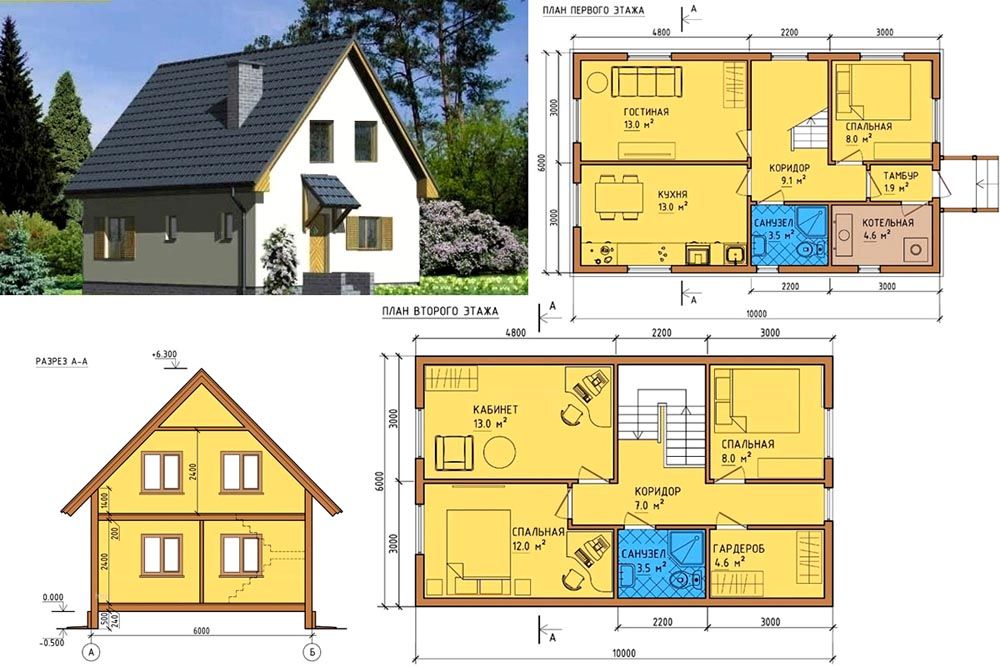 La vivienda propia, aunque sea muy pequeña, siempre es buena. El área óptima en la que una familia de dos o tres personas puede cómodamente y a un costo mínimo es de 30 a 36 metros cuadrados. El diseño de la casa es de 6 por 6 metros cuadrados. m. Le permitirá colocar convenientemente todo lo que necesita para la vida, especialmente si construye un edificio de dos pisos. Una cabaña de madera, ladrillo y bloques de este tamaño se convertirá en una cabaña de verano o en una estructura para residencia permanente. El proyecto se compila en papel o usando programas especiales de computadora.