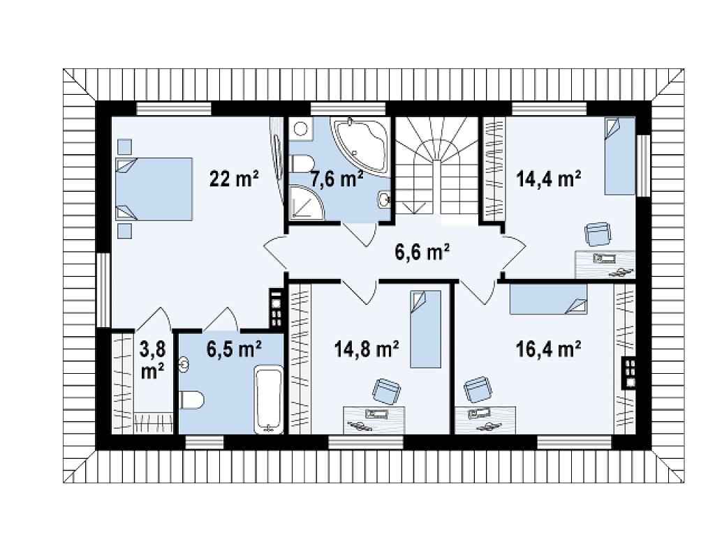 Altura cómoda del techo en el punto más alto: al menos dos metros y medio. La mayor parte del espacio del ático debe cumplir con este principio. Colocan un dormitorio completo, vestidor, baño, oficina, etc. Si lo desea, casi todo el piso puede estar ocupado por una sala de estar.