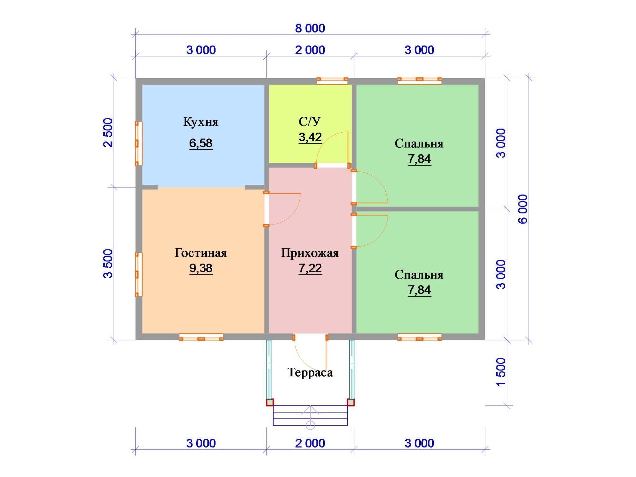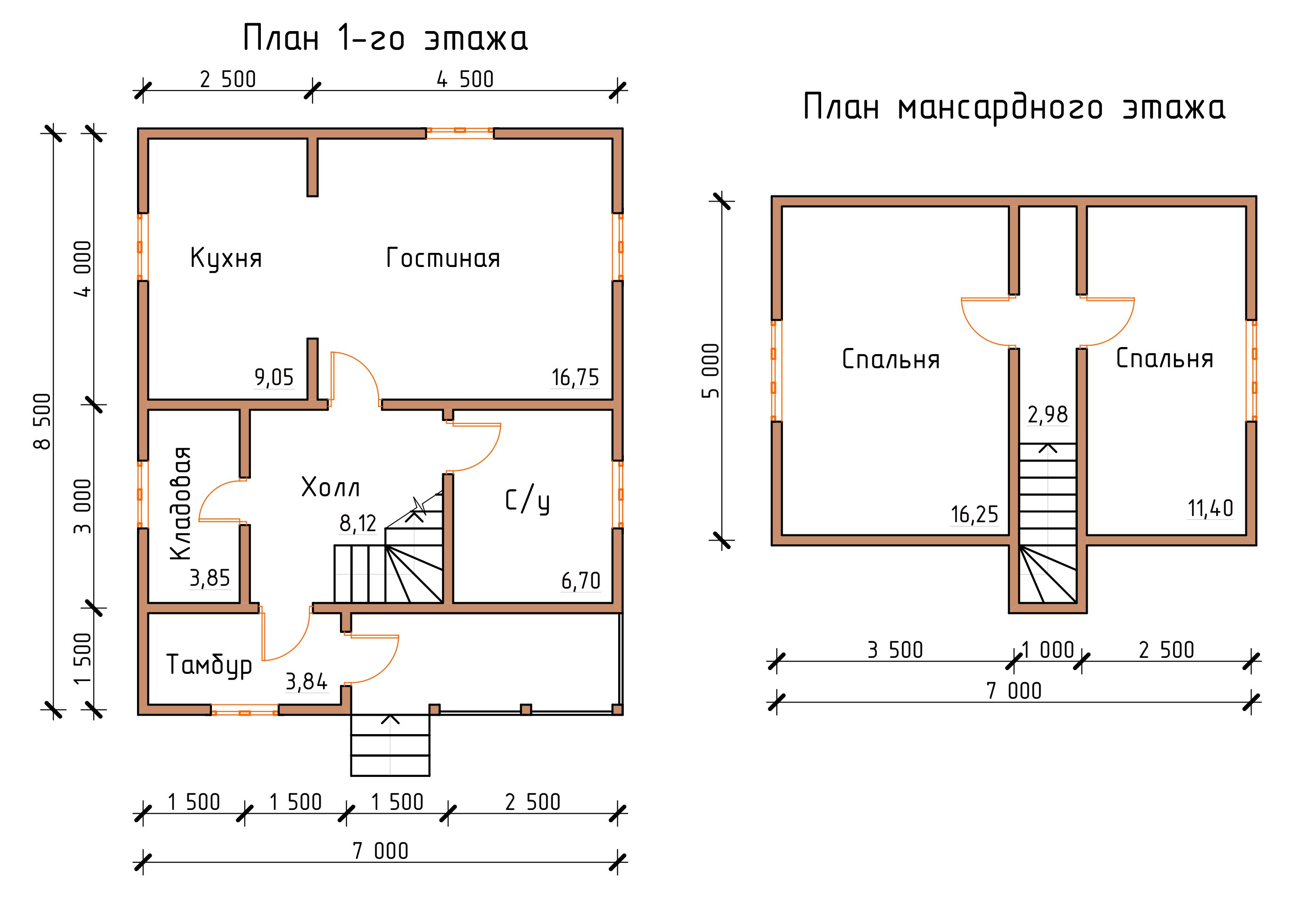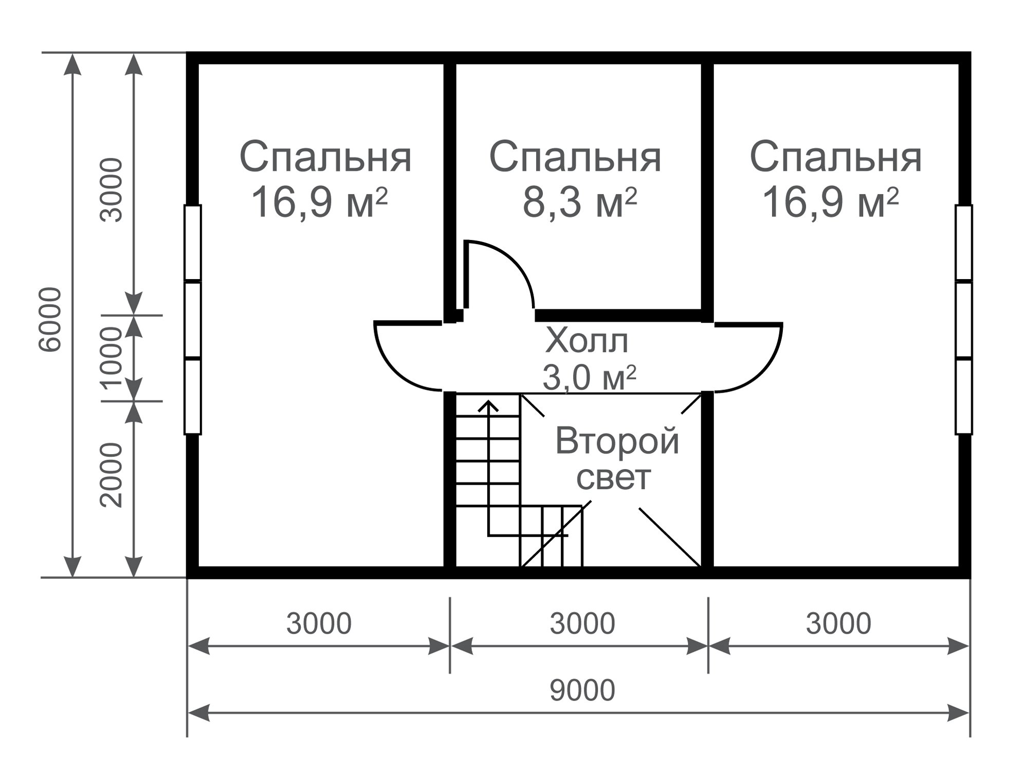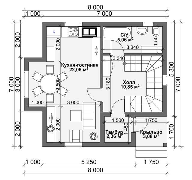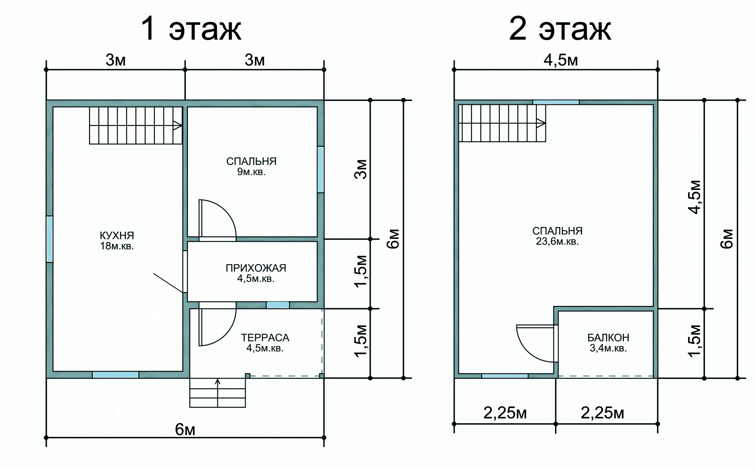En la planta baja generalmente hay un baño con ducha o bañera, una sala de calderas, calefacción de toda la casa, cocina, sala de estar. La mejor forma para cualquier habitación es cuadrada o casi cuadrada, el ancho óptimo es de 2.5-3 metros. Prácticamente no hay un corredor como tal: el ancho del pasillo, donde se encuentra la escalera, se mide aproximadamente un metro y medio.