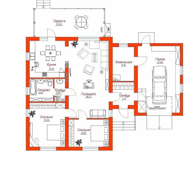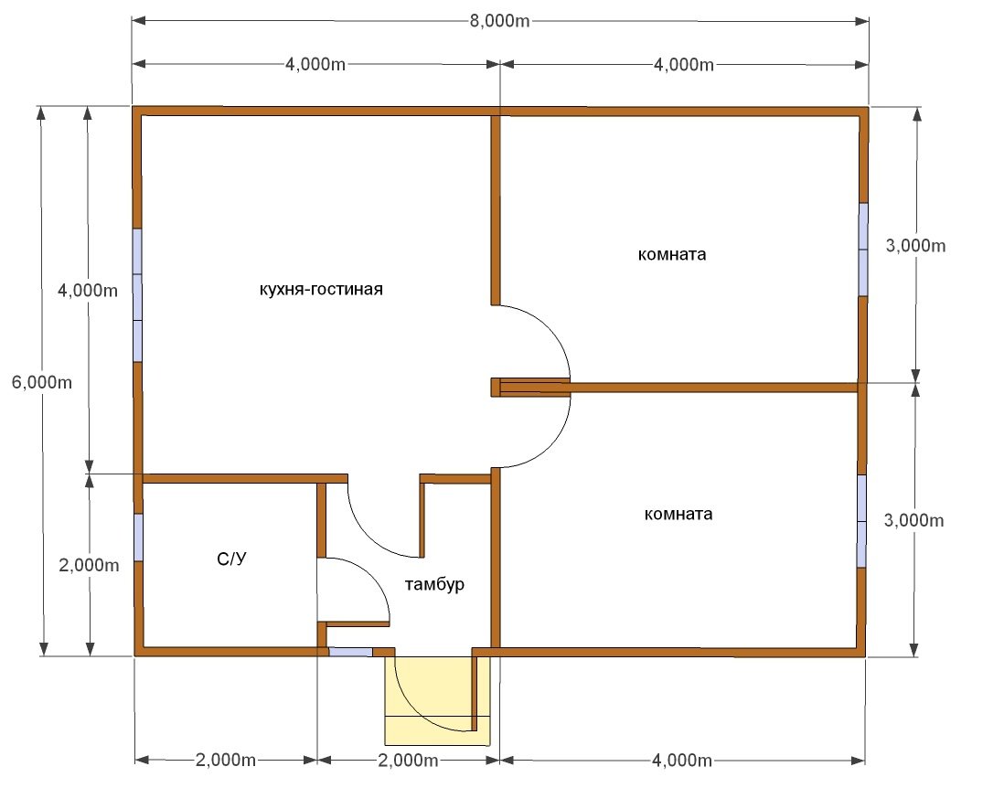 La casa debe tener una sala de estar y varios auxiliares. Al planificar una sala, es mejor organizarla en el medio, para dividir el edificio en dos zonas funcionales con su ayuda. Por un lado, se recomienda organizar un dormitorio y un pasillo, por otro lado, un horno, un baño, una cocina. El área de la cocina debe estar ubicada al lado del baño, esto ahorrará en servicios de plomería, cumplirá con el nivel requerido de la pendiente de las tuberías de salida.