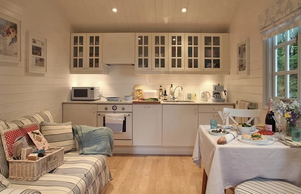 Una casa compacta, comparable en tamaño a un apartamento de dos habitaciones, es elegida por parejas mayores y familias sin hijos. Esta es una buena opción para una residencia de verano, le permite pasar cómodamente el fin de semana. En un área pequeña, generalmente coloque una sala de estar, dormitorio, cocina, baño, sala de calderas. A menudo, el pasillo se combina con el área de la cocina. De las ventajas de dicha estructura se pueden identificar: