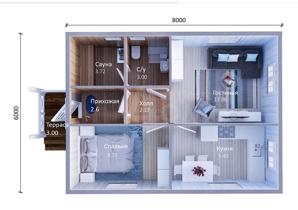 La implementación del proyecto de una casa de 6x8 metros permite construir un edificio residencial adecuado para una vida confortable de una familia de cuatro personas. El área pequeña del edificio lo hace similar a un apartamento de una, dos habitaciones. La pequeña casa incluye todas las habitaciones principales, así como la sala de calderas. Esta opción se caracteriza por las siguientes ventajas: