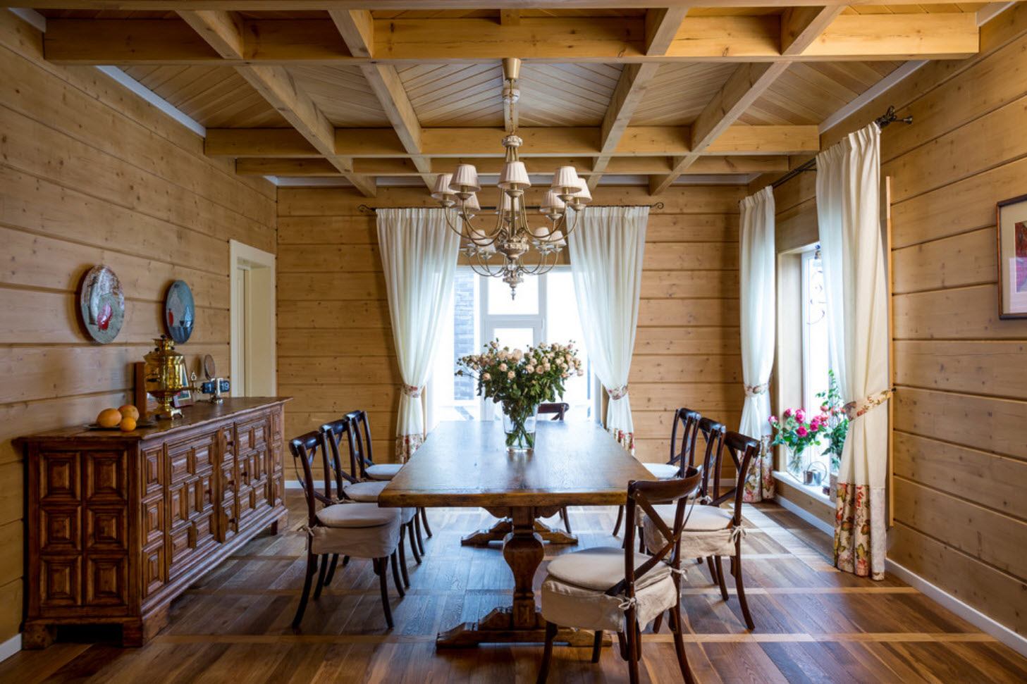 El marco, todas las estructuras de soporte, el piso debe estar hecho de un solo material. A menudo usa roble, alerce. Para que no haya distorsiones, es importante acoplar correctamente todos los detalles. Es mejor no usar sujetadores de metal, ya que pueden causar aflojamiento de los elementos y descomposición. Es mejor usar alfileres de madera. Desde el exterior, el marco está revestido con tablas en ángulo.Esto lo hará más duradero, resistente.