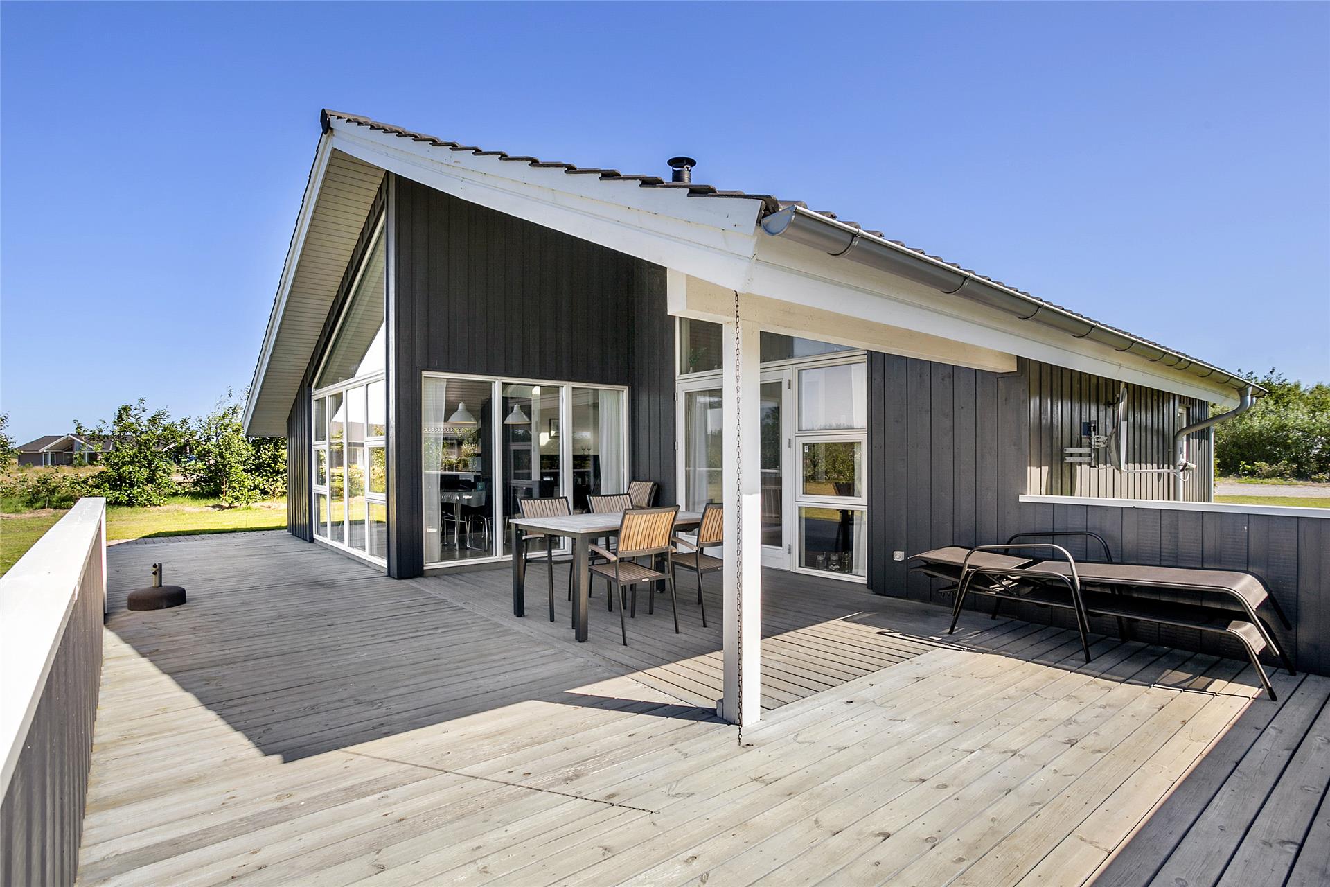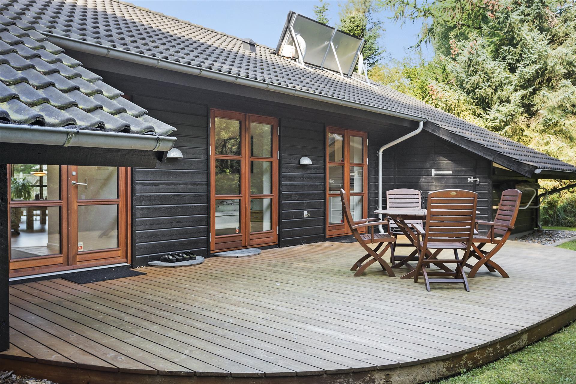 Si el área de la residencia de verano lo permite, hay una mesa de comedor y cómodas tumbonas en la terraza. La pérgola de madera protege del sol. Para proteger el porche, marque sus límites con la ayuda de una madera o un seto.