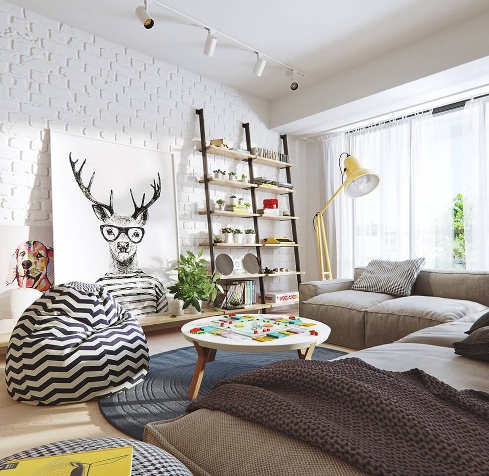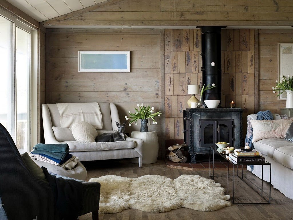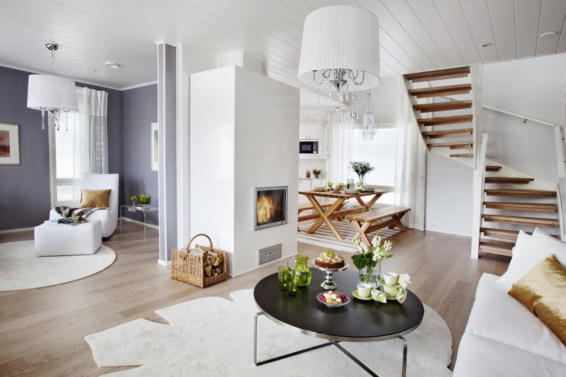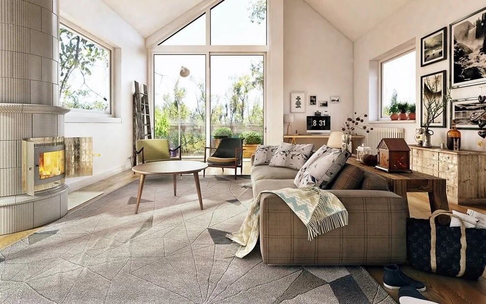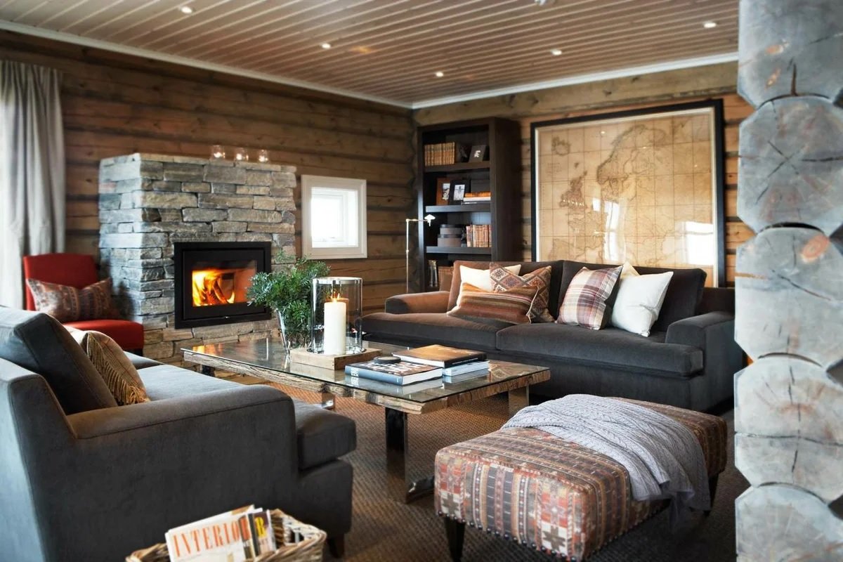 El énfasis principal en las salas de estar escandinavas está en la chimenea. La pila de madera decorativa ubicada cerca y una piel de animal natural en el piso agregarán comodidad y confort. Como accesorios, use pegatinas de pared, pinturas en blanco y negro, fotografías. Las almohadas brillantes en el sofá ayudarán a crear un ambiente.