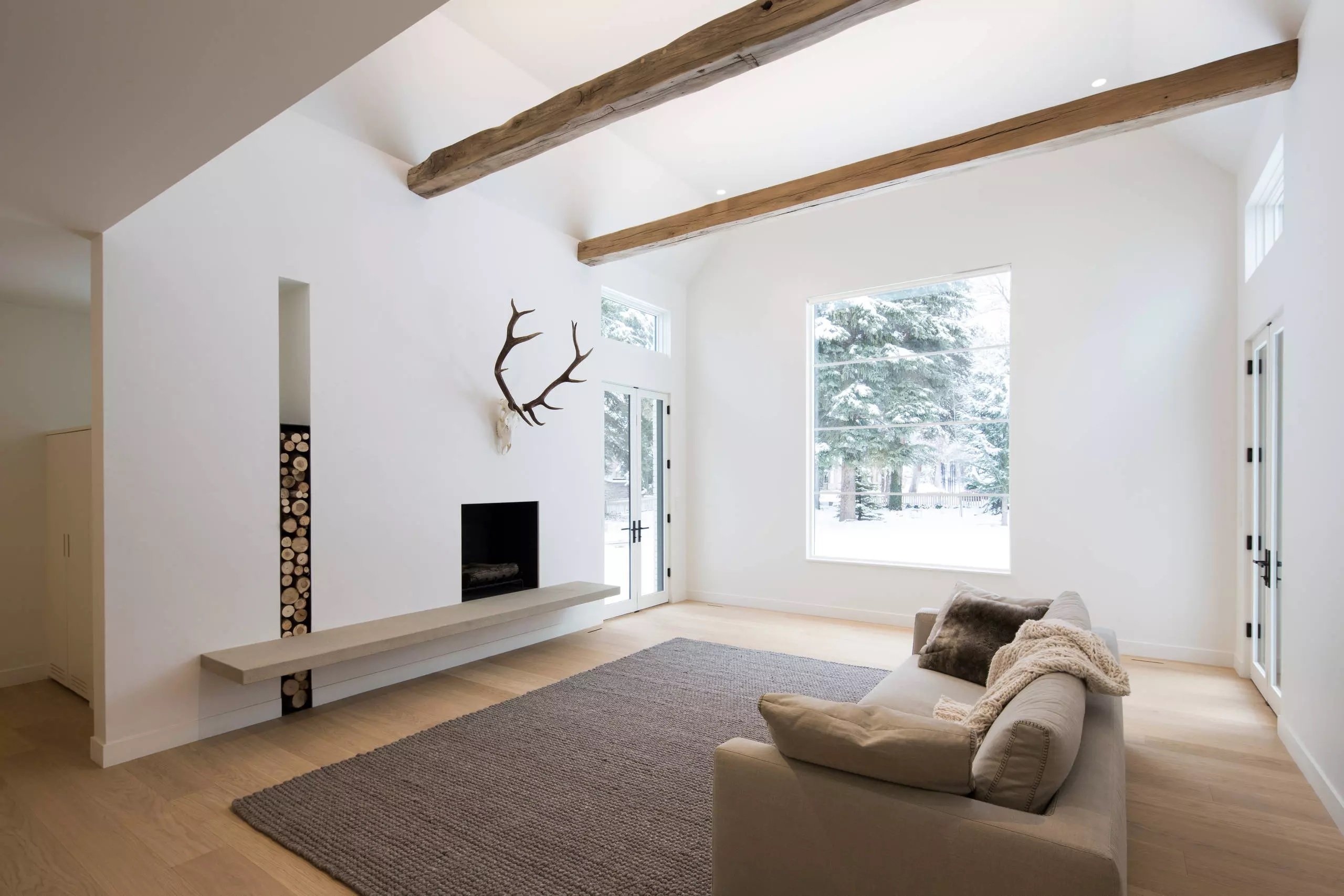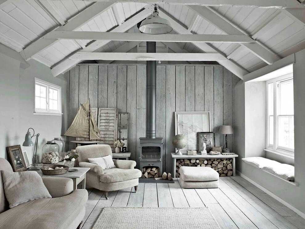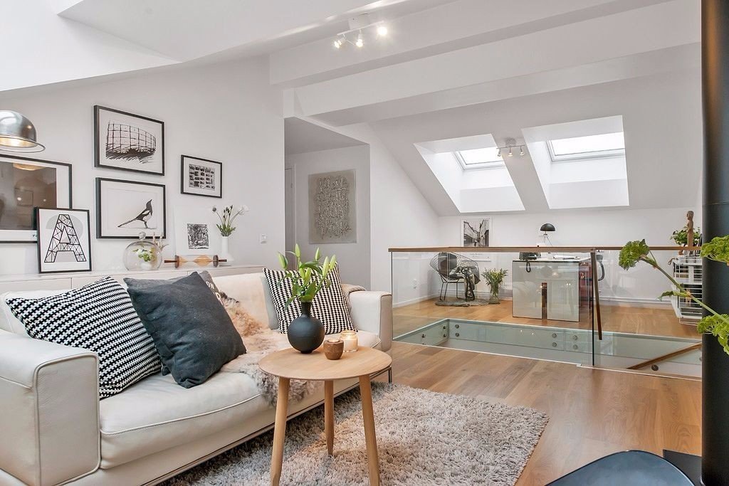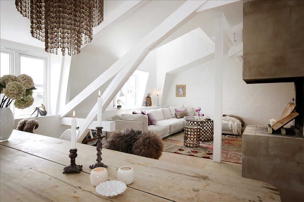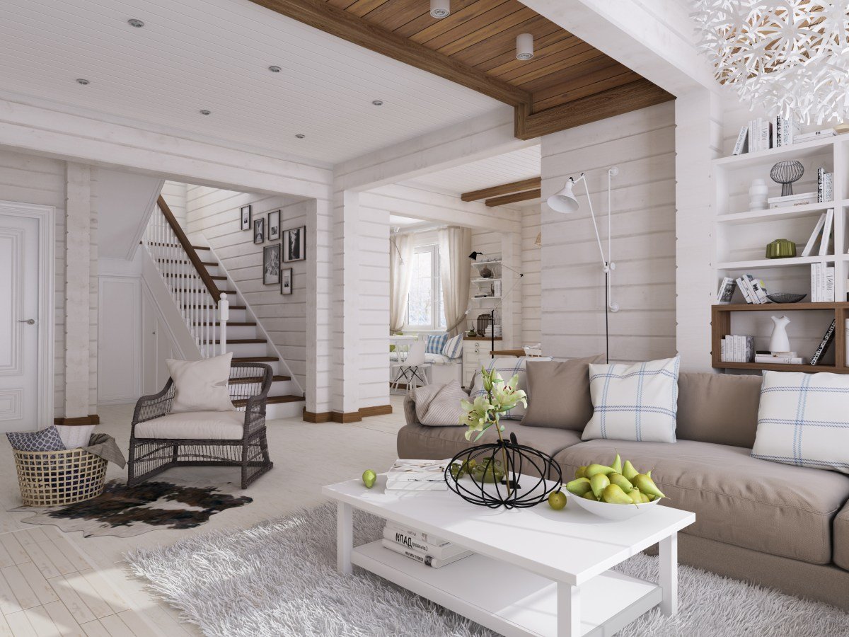 El énfasis principal en las salas de estar escandinavas está en la chimenea. La pila de madera decorativa ubicada cerca y una piel de animal natural en el piso agregarán comodidad y confort. Como accesorios, use pegatinas de pared, pinturas en blanco y negro, fotografías. Las almohadas brillantes en el sofá ayudarán a crear un ambiente.