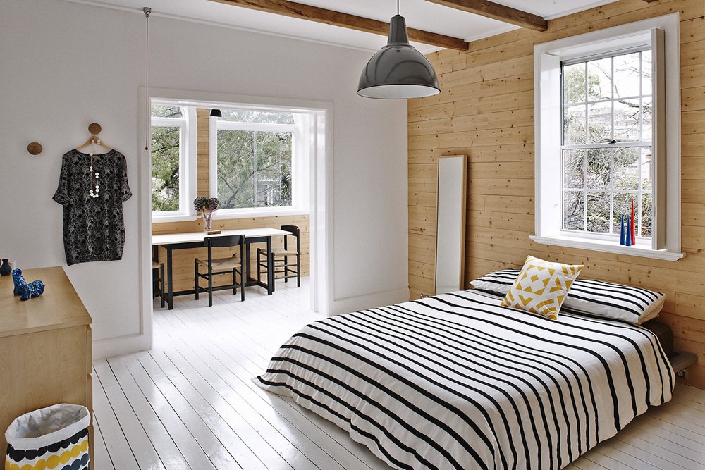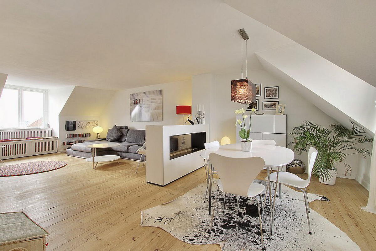 Las alfombras y los tapetes no se usan al diseñar un piso al estilo escandinavo. Se permiten pequeñas alfombras con una pila alta junto a la cama, piel de animal natural junto a la chimenea o en el centro de la habitación.