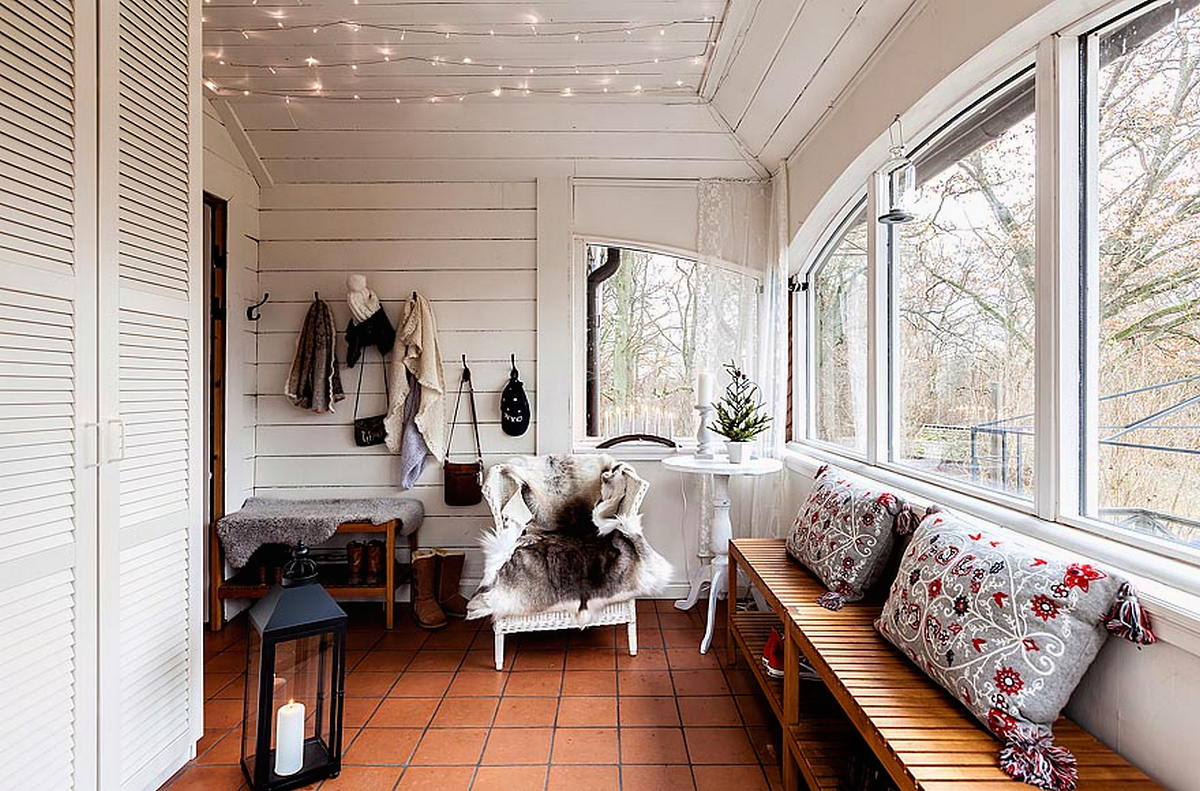 El área adyacente a la entrada de la casa a menudo se convierte en un acogedor lugar de descanso. Una pequeña terraza será una solución práctica y estética. En una pequeña elevación del suelo, se instalan y pintan tableros de cubierta para que coincida con la fachada del edificio. El porche está decorado con bancos simples, plantas naturales en tinas.