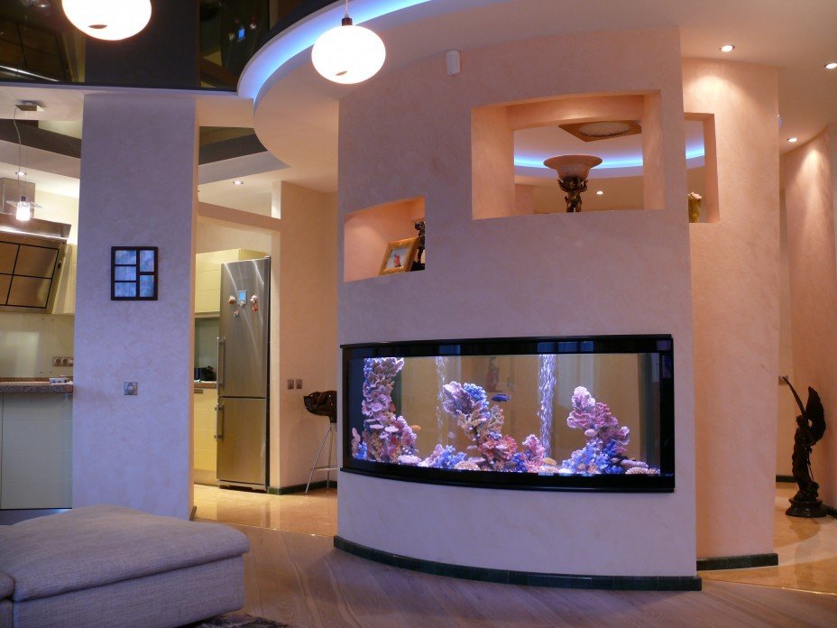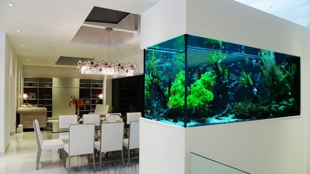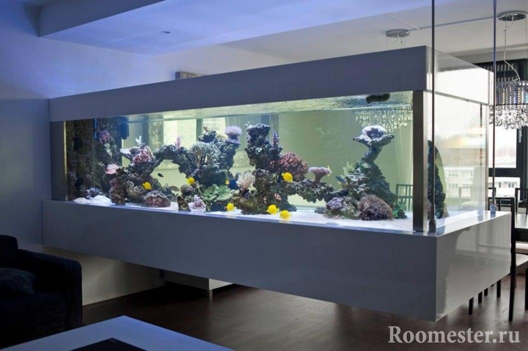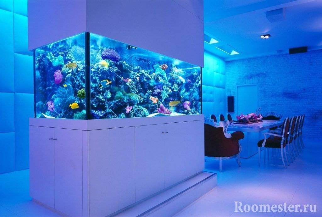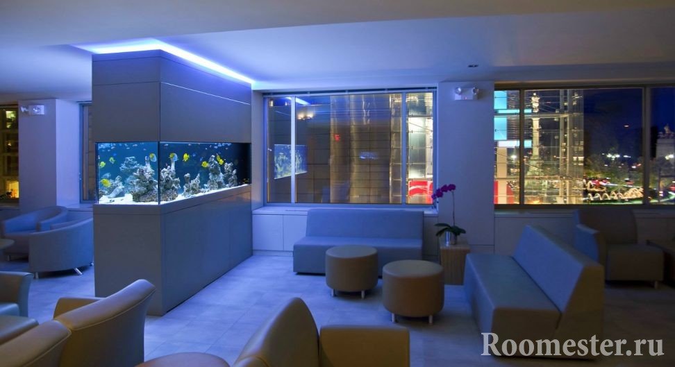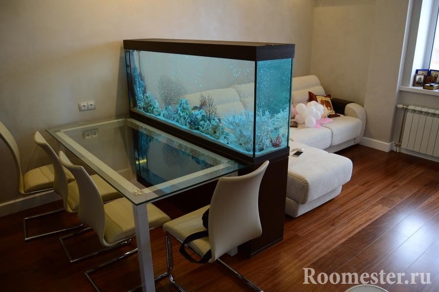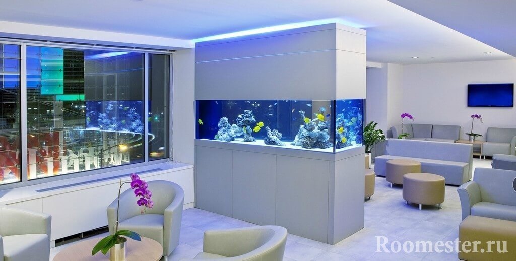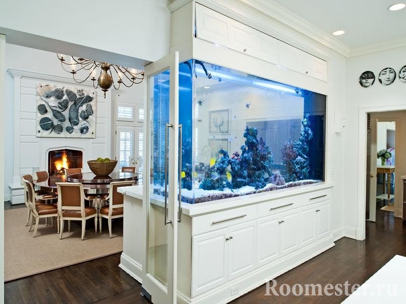 La partición del acuario en el diseño de su hogar u oficina es perfecta. Crea la ilusión de privacidad, al mismo tiempo expande el espacio, lo hace brillante, la luz penetra libremente en cualquier rincón de la habitación.