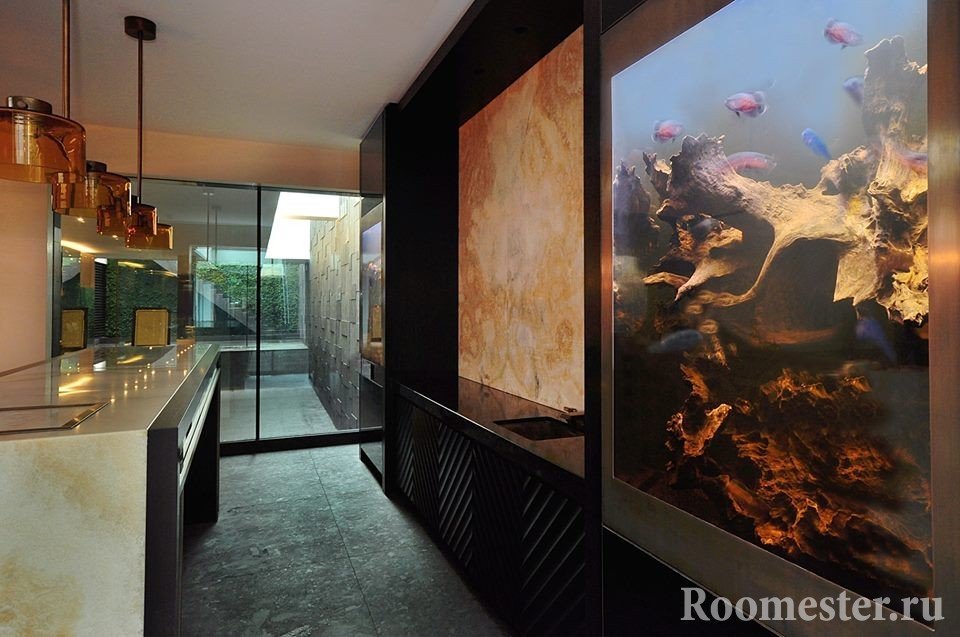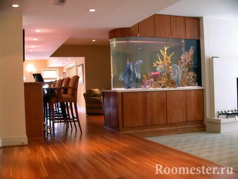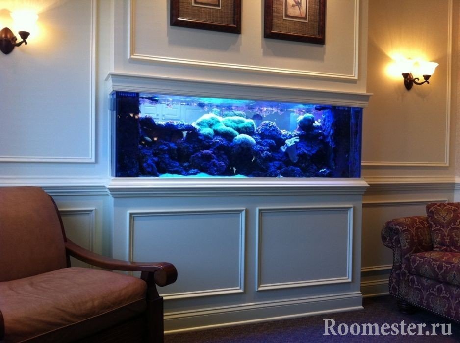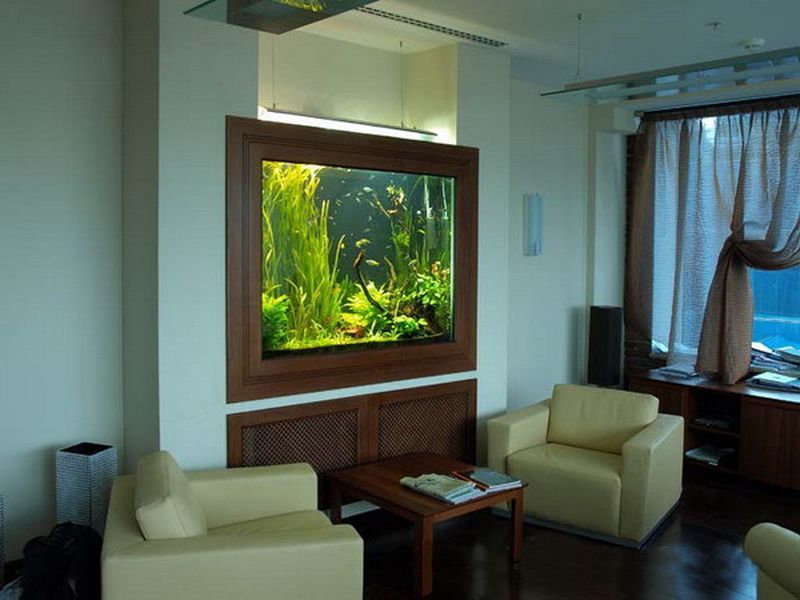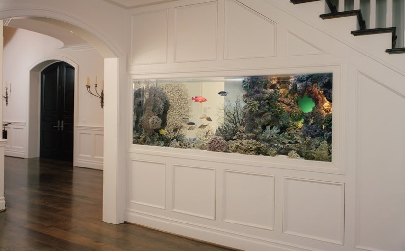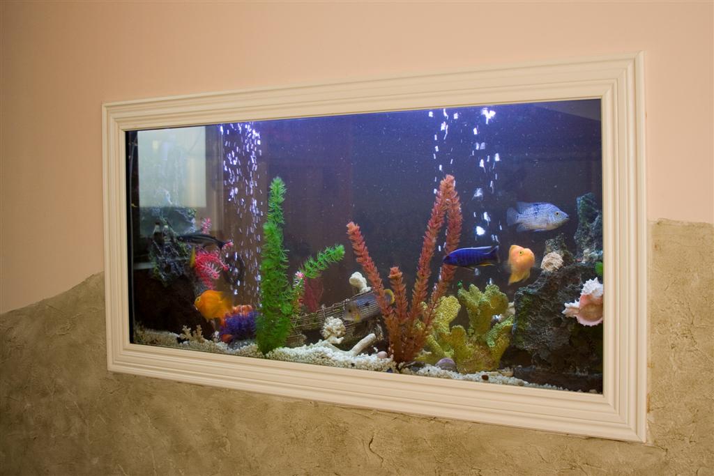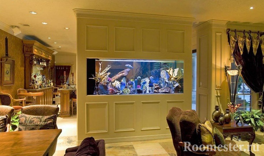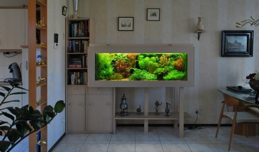 El acuario incorporado requiere planificación incluso en la etapa de creación de un proyecto de diseño para determinar de antemano de qué lado se proporcionará el servicio, a qué habitantes poblarlo. Si el tanque está entre habitaciones donde no se requiere transparencia, está poblado con algas densas.
