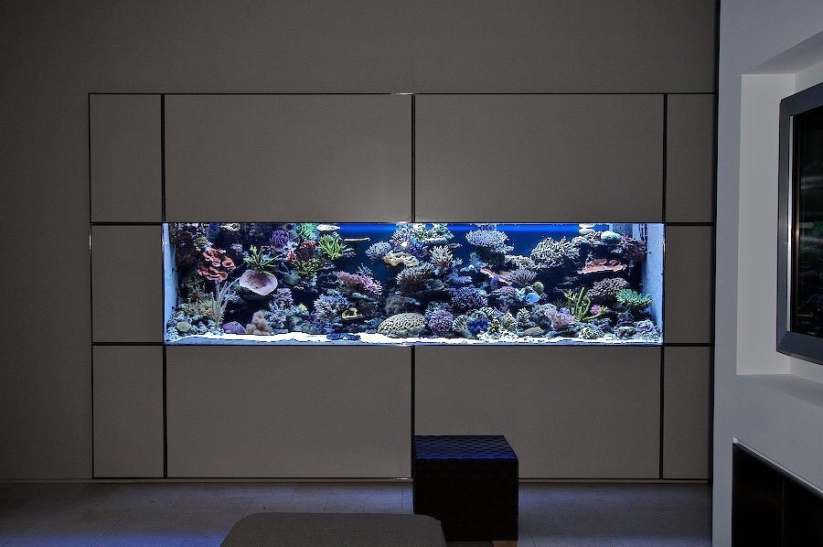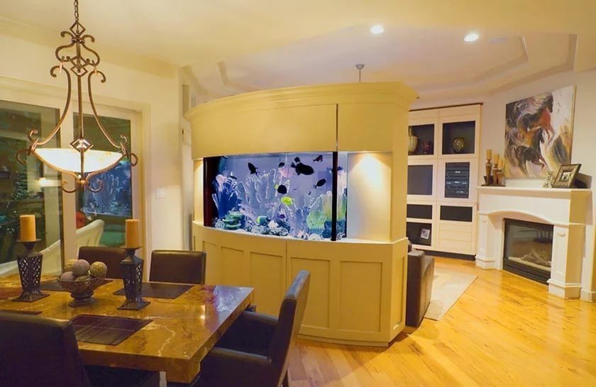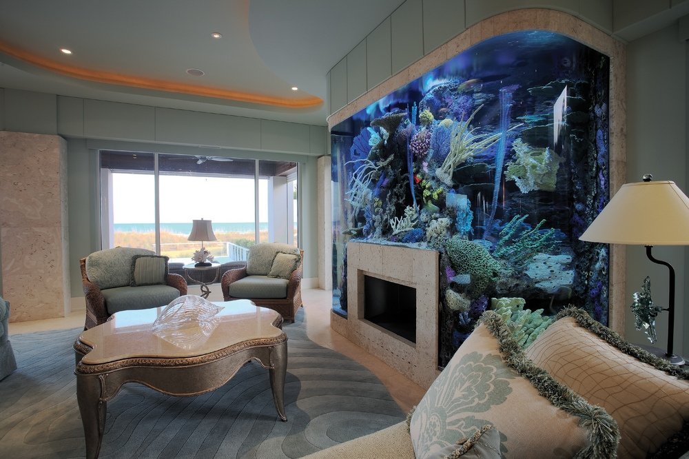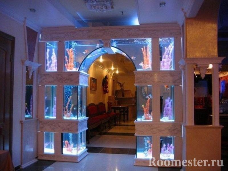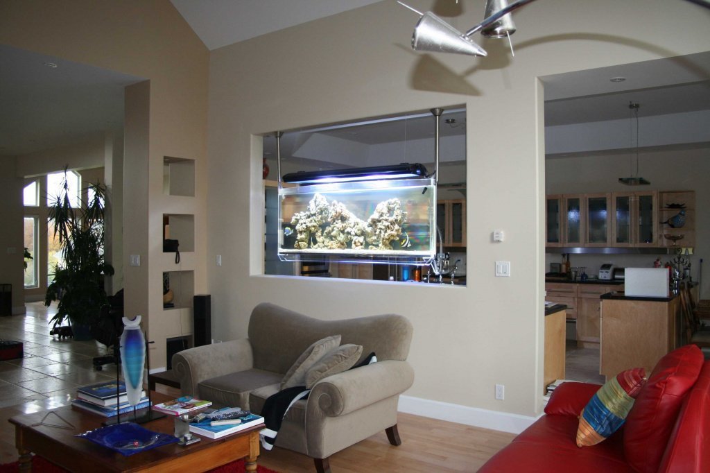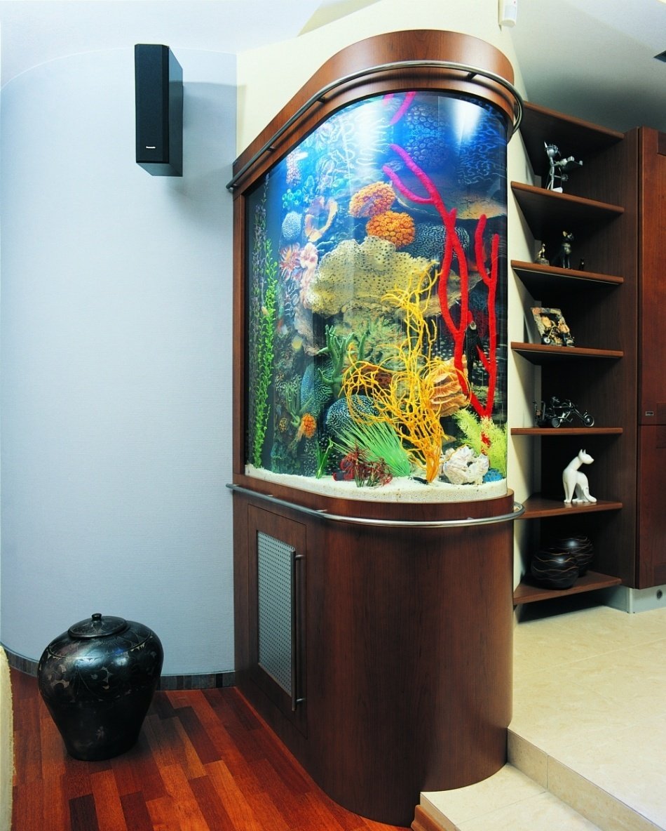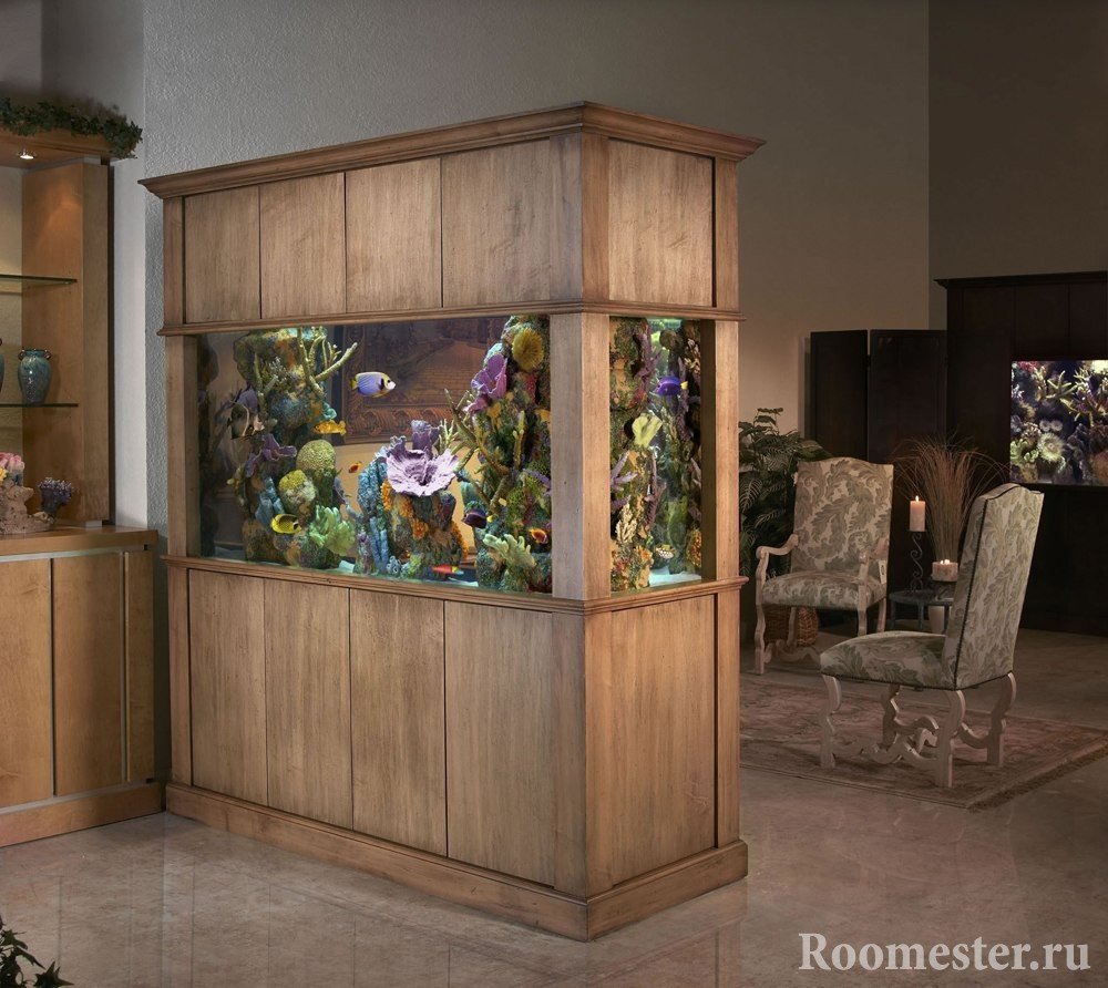 El acuario incorporado requiere planificación incluso en la etapa de creación de un proyecto de diseño para determinar de antemano de qué lado se proporcionará el servicio, a qué habitantes poblarlo. Si el tanque está entre habitaciones donde no se requiere transparencia, está poblado con algas densas.
