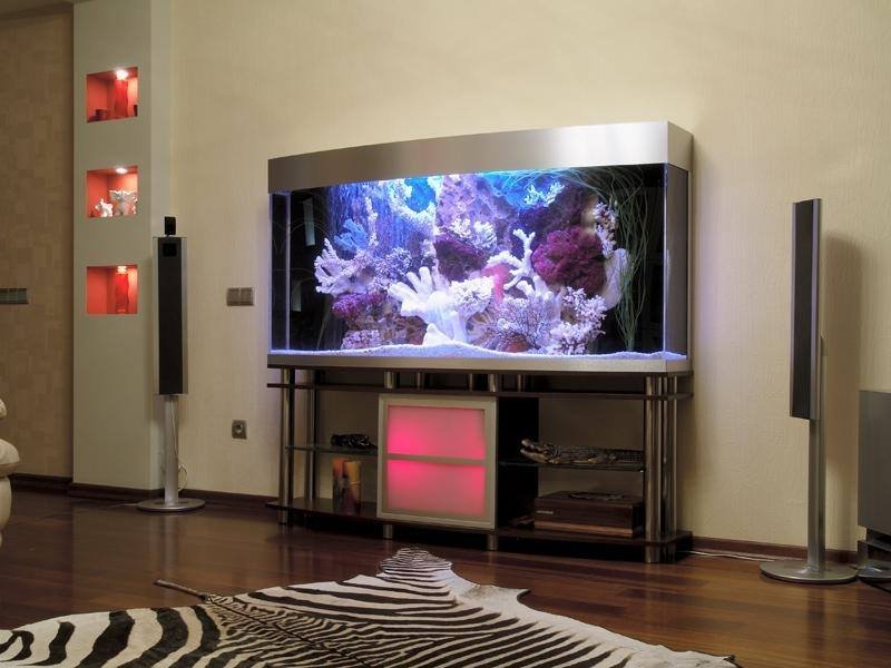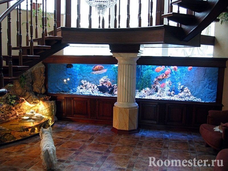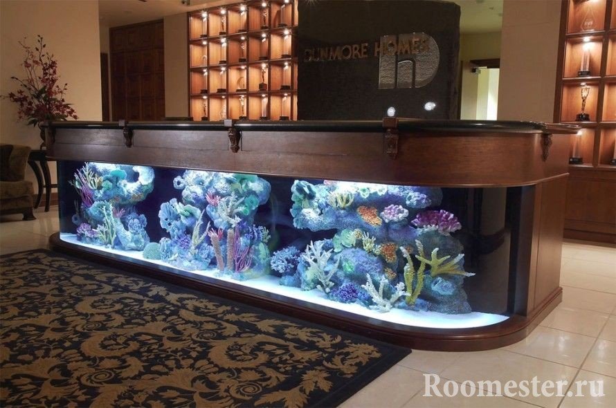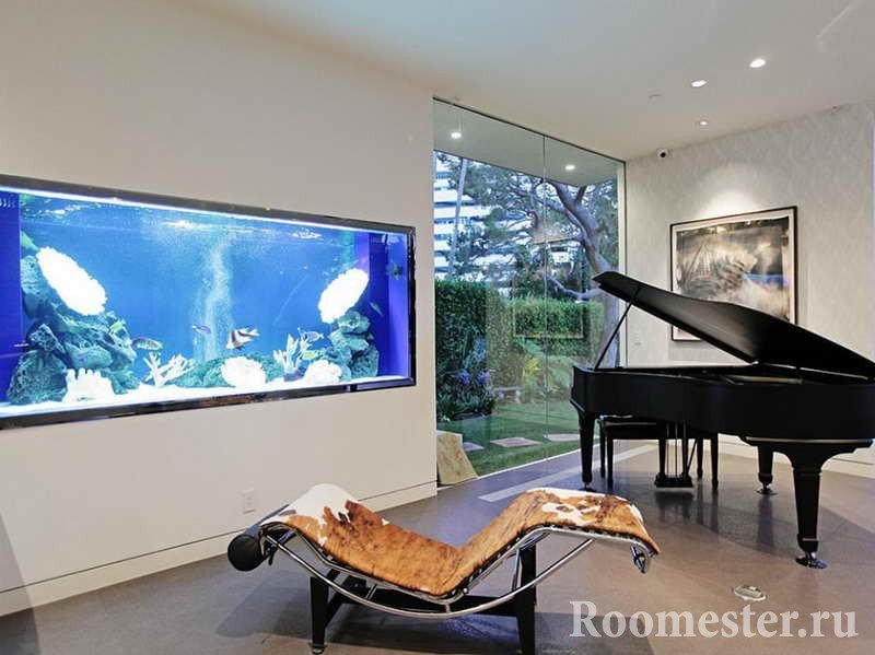 El deseo de llenar el hogar con cosas exóticas conduce a decisiones inesperadas. Puede comprar un soporte especial para acomodar un acuario grande, pero se ve voluminoso, requiere poco espacio. Los acuarios integrados en paredes y muebles son una excelente opción.
