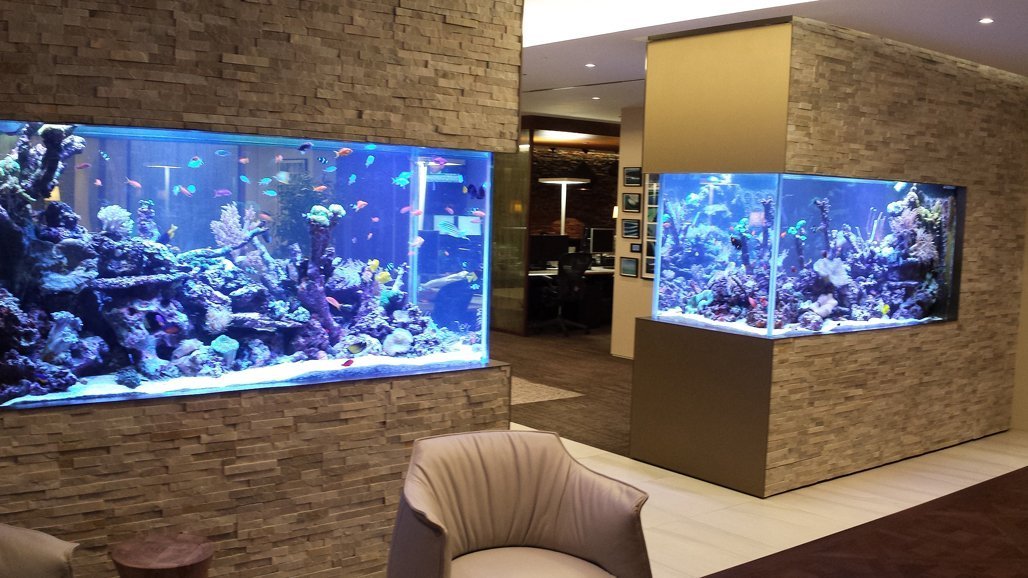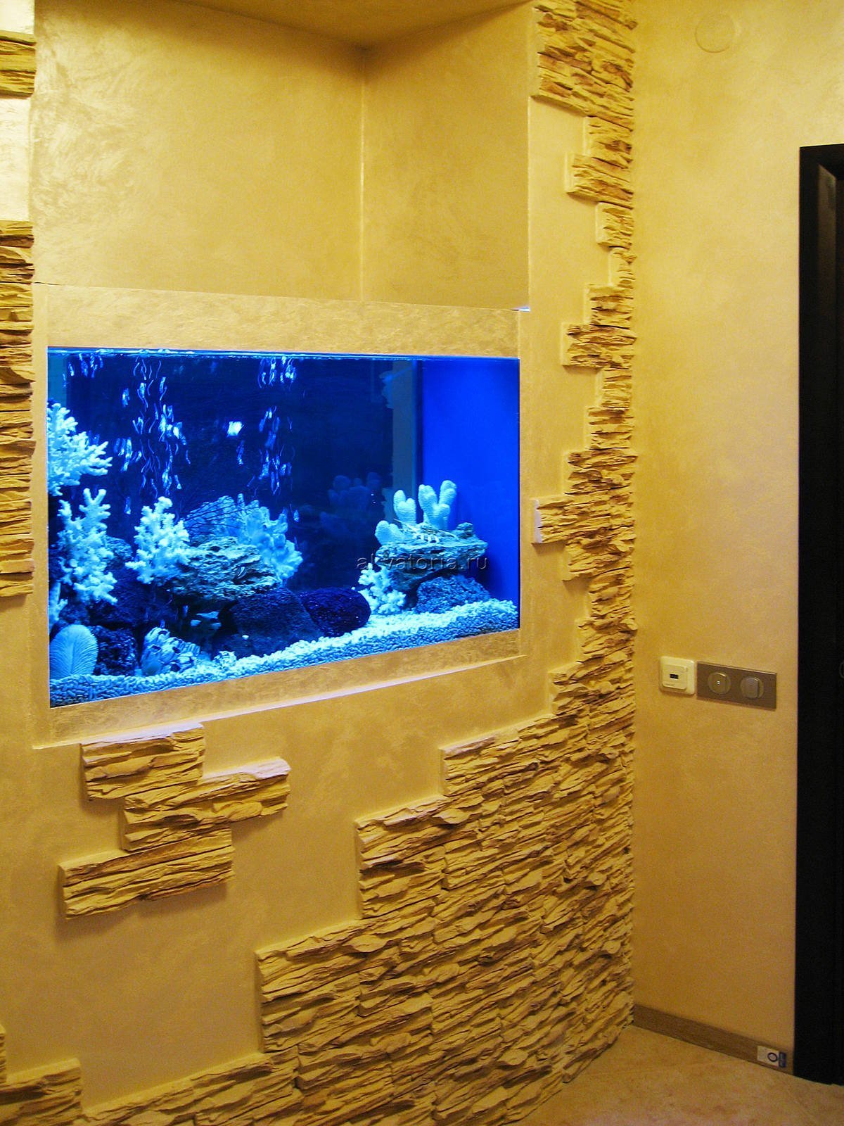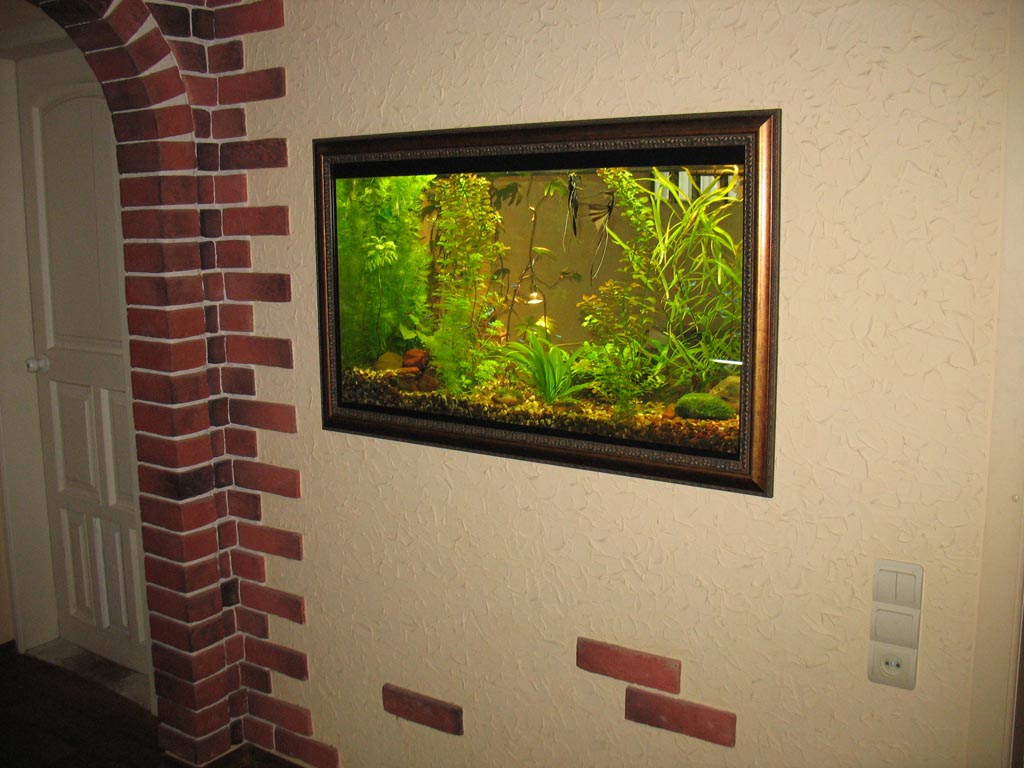 Existen varias opciones de instalación, entre las cuales se encuentra la integración del acuario en la pared interior. Con este arreglo, se puede ver a través. Se requerirá una filtración mejorada, es deseable la esterilización ultravioleta, ya que La menor turbidez del agua puede nivelar el efecto. Desde este punto de vista, es mucho más rentable instalar un acuario con la cara posterior cerrada. Otro diseño se instala en un pedestal o como balcón, en una placa que sobresale de la pared.
